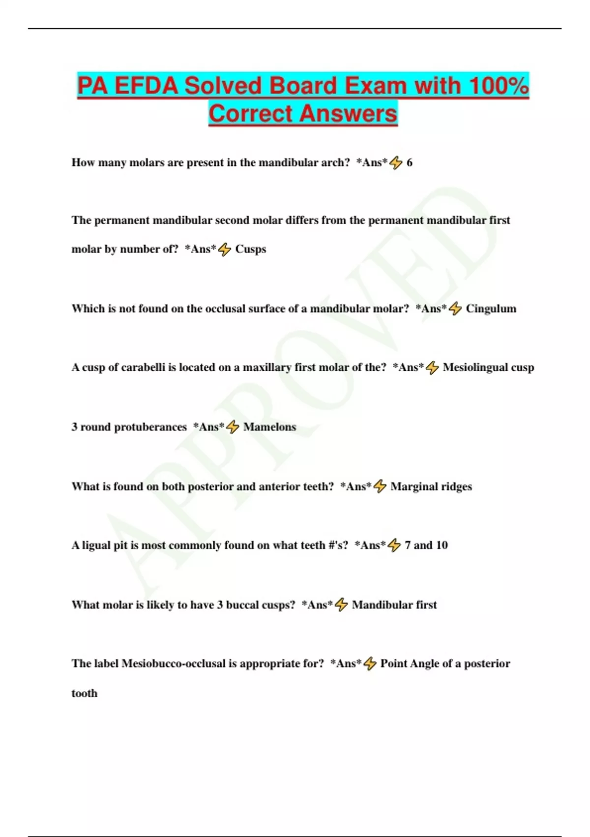 PA EFDA Solved Board Exam with 100% Correct Answers How many molars are present in the mandibular arch? *Ans* 6 The permanent mandibular second molar differs from the permanent mandibular first molar by number of? *Ans* Cusps Which is not found on the occlusal surface of a mandibular molar? *Ans* Cingulum A cusp of carabelli is located on a maxillary first molar of the? *Ans* Mesiolingual cusp 3 round protuberances *Ans* Mamelons What is found on both posterior and anterior teeth? *Ans* Marginal ridges A ligual pit is most commonly found on what teeth #'s? *Ans* 7 and 10 What molar is likely to have 3 buccal cusps? *Ans* Mandibular first The label Mesiobucco-occlusal is appropriate for? *Ans* Point Angle of a posterior tooth On a maxillary first premolar what is the groove that sperates the buccal and lingual cusps? *Ans* Central groove The molar with a Y,H, or U pattern *Ans* Mandibular second premolar A facial and lingual triangular ridge join to form? *Ans* Transverse ridge Cusps for a mandibular first molar *Ans* mesiolingual, mesiofacial, distolingual, distofacial, distal Major difference between first and second molars? *Ans* 1st molars has 5 cusps, 2nd molars have 4 cusps Which is true of oblique ridges? *Ans* Only Maxillary molars have Oblique ridges Facial surfaces of teeth include what? *Ans* Labial and Buccal surfaces Elevated crests of enamel that form mesial and distal margins of the occlusal surface *Ans* Marginal ridges The bulk of a tooth is made up of *Ans* Denti
