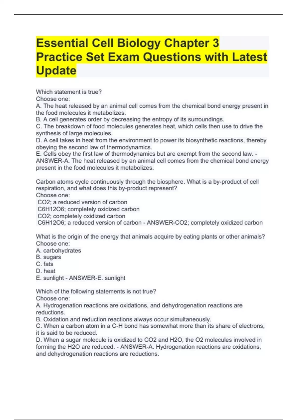 Which statement is true? Choose one: A. The heat released by an animal cell comes from the chemical bond energy present in the food molecules it metabolizes. B. A cell generates order by decreasing the entropy of its surroundings. C. The breakdown of food molecules generates heat, which cells then use to drive the synthesis of large molecules. D. A cell takes in heat from the environment to power its biosynthetic reactions, thereby obeying the second law of thermodynamics. E. Cells obey the first law of thermodynamics but are exempt from the second law. - ANSWER-A. The heat released by an animal cell comes from the chemical bond energy present in the food molecules it metabolizes. Carbon atoms cycle continuously through the biosphere. What is a by-product of cell respiration, and what does this by-product represent? Choose one: CO2; a reduced version of carbon C6H12O6; completely oxidized carbon CO2; completely oxidized carbon C6H12O6; a reduced version of carbon - ANSWER-CO2; completely oxidized carbon What is the origin of the energy that animals acquire by eating plants or other animals? Choose one: A. carbohydrates B. sugars C. fats D. heat E. sunlight - ANSWER-E. sunlight Which of the following statements is not true? Choose one: A. Hydrogenation reactions are oxidations, and dehydrogenation reactions are reductions. B. Oxidation and reduction reactions always occur simultaneously. C. When a carbon atom in a C-H bond has somewhat more than its share of electrons, it is said to be reduced. D. When a sugar molecule is oxidized to CO2 and H2O, the O2 molecules involved in forming the H2O are reduced. - ANSWER-A. Hydrogenation reactions are oxidations, and dehydrogenation reactions are reductions.