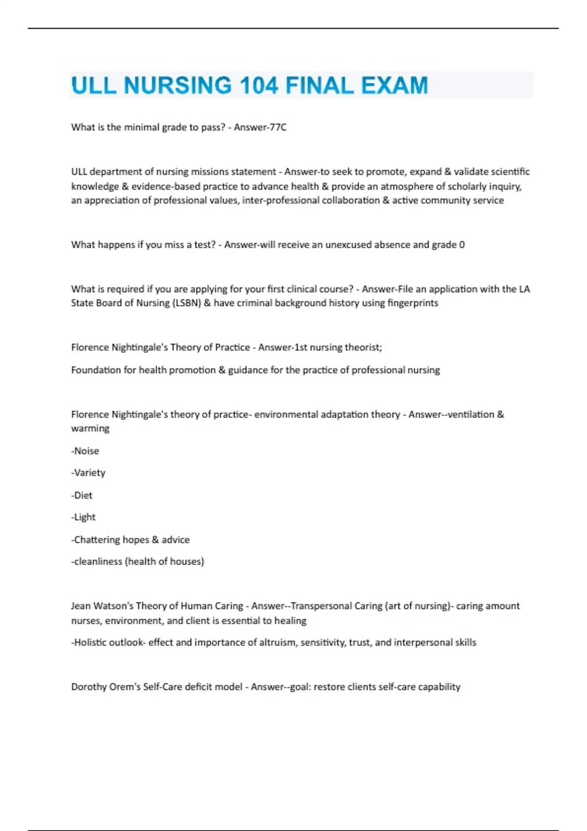 What is the minimal grade to pass? - Answer-77C ULL department of nursing missions statement - Answer-to seek to promote, expand & validate scientific knowledge & evidence-based practice to advance health & provide an atmosphere of scholarly inquiry, an appreciation of professional values, inter-professional collaboration & active community service What happens if you miss a test? - Answer-will receive an unexcused absence and grade 0 What is required if you are applying for your first clinical course? - Answer-File an application with the LA State Board of Nursing (LSBN) & have criminal background history using fingerprints Florence Nightingale's Theory of Practice - Answer-1st nursing theorist; Foundation for health promotion & guidance for the practice of professional nursing Florence Nightingale's theory of practice- environmental adaptation theory - Answer--ventilation & warming -Noise -Variety -Diet -Light -Chattering hopes & advice -cleanliness (health of houses) Jean Watson's Theory of Human Caring - Answer--Transpersonal Caring (art of nursing)- caring amount nurses, environment, and client is essential to healing -Holistic outlook- effect and importance of altruism, sensitivity, trust, and interpersonal skills Dorothy Orem's Self-Care deficit model - Answer--goal: restore clients self-care capability-Purposeful Nursing Intervention-Facilitates client self-care by measuring the client's deficit relative to self-care needs; Implements appropriate measures to assist the client in meeting these needs by matching them with an appropriate supportive intervention Patricia Benner's Novice to Expert - Answer-stages of clinical competence; one of the most useful frameworks for assessing nurses' needs at different stages of professional growth Patricia Benner's 5 levels of nursing experience - Answer-novice, advanced, beginner, competent, proficient, and expert what is the minimum GPA required for admission into the 200 level nursing course? - Answer-2.8 Students who earn a D or F in 2 or more required non-nursing courses - Answer-Will not be allowed to major in nursing at UL Lafayette patient centered care - Answer-providing care that is respectful of and responsive to individual patient preferences, needs, and values and ensuring that patient values guide all clinical decisions Health Insurance Portability and Accountability Act (HIPAA) - Answer-Mandates protection of an individual's privacy by health care providers and throughout society Nurse Practice Act - Answer-right granted by a state to protect those who need nursing care. The guidelines of the NPA and its rules provide safe parameters within which to work and protect patients from unprofessional and unsafe nursing practice NCLEX (National Council Licensure Examination) - Answer-a nationwide examination for the licensing of nurses in the United States; administered through the state boards of nursing State Board of Nursing - Answer-A state board of nursing holds the legal authority for nursing practice and regulates nursing practice through: Establishing the requirements to obtain a nursing licenseIssuing nursing licenses Determining the scope of practice Setting minimum education standards Managing disciplinary procedures What do you have to do if wanting to work as a nurse in a different state? - Answer-contact that state's board of nursing and see what they require of you State Board's process if you did something bad. - Answer-they first investigate, then they put you into a program to help with whatever you did, they are never looking to take your license (as long as what you did was not to intentionally to harm someone else) Drinking blood alcohol concentration? - Answer-over 21- 0.08% under 21- 0.00% Nurse Licensure Compact - Answer-• Mutual recognition model for nursing licensure; maintain home state license, but may practice in any party state What enables nurses to work in different states using the same license? - Answer-the nurse licensure compact (24 states in it) Institution Review Board (IRB) - Answer-there to protect the patient(s) you want to do the research/study on; protects ethical rights of patients; examine the proposal of what research you want to do nursing ethics - Answer-system of principles that govern the actions of the nurse in relation to patients, families, other health care providers, policymakers, and societybeneficience and nonmaleficence - Answer-largest a balance of risk & benefit; the risk for harm must be weighed against the possible benefits; the risk should never be greater than the importance of the problem to be solved Beneficence - Answer-an ethical principle of compassion and patient advocacy, stating that one should do good and prevent or avoid doing harm Nonmaleficence - Answer-an ethical principle stating the duty to not inflict harm The Joint Commission - Answer--One of the first accreditation agencies to embrace QI principles as an accreditation requirement in hospital-based setting -"Gold seal of approval" by following the quality and safety standards established by the TJC -Accredits ambulatory clinics, hospitals, health care organizations, and long-term care facilities To Err is Human: building a safer health system - Answer--Placed the issue of medical mistakes & patient safety on the pages on many national newspapers, on the agendas of health care governing boards, & at the forefront of federal government legislation - ~98,000 patients die each year from preventable medical errors -Poor quality of care is a major problem in the US Institute of Medicine (IOM) - Answer-A branch of the National Academy of Sciences whose goal is to advance and distribute scientific knowledge with the mission of improving human health (IOM 2013); nonprofit organization IOM 6 guiding aim for improvement: STEEEP - Answer-•Safe - preventing injuries to patients from the care that is intended to help them •Timely - reducing waits & delays •Effective - providing services to those who benefit •