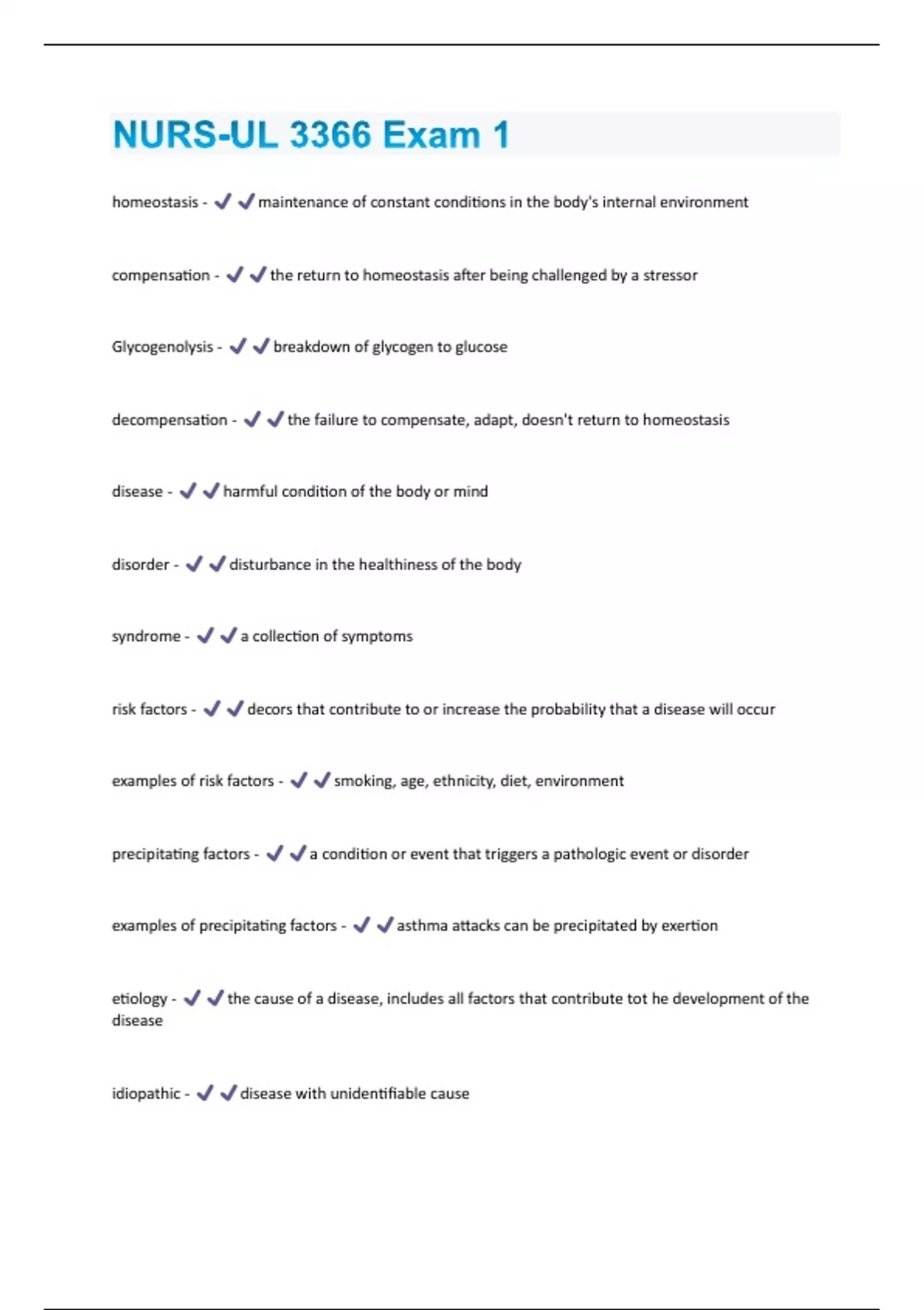 homeostasis - maintenance of constant conditions in the body's internal environment compensation - the return to homeostasis after being challenged by a stressor Glycogenolysis - breakdown of glycogen to glucose decompensation - the failure to compensate, adapt, doesn't return to homeostasis disease - harmful condition of the body or mind disorder - disturbance in the healthiness of the body syndrome - a collection of symptoms risk factors - decors that contribute to or increase the probability that a disease will occur examples of risk factors - smoking, age, ethnicity, diet, environment precipitating factors - a condition or event that triggers a pathologic event or disorder examples of precipitating factors - asthma attacks can be precipitated by exertion etiology - the cause of a disease, includes all factors that contribute tot he development of the disease idiopathic - disease with unidentifiable causeiatrogenic - occurs as a result of medical treatment nosocomial infection - hospital acquired infection clinical manifestations - the demonstration of the presence of a sign or symptom sign - manifestations that can only be objectively ideated by a trained symptoms - subjective manifestations that can be only reported by the person experiencing them local S&S - redness, swelling, heat, rash and lymphadenopathy in a particular area system S&S - fever, urticaria, malaise, systemic lymphadenopathy acute S&S - fairly rapid appearance of disease of several days, usually only last a short time chronic S&S - develop slowly and often insidious and last longer remissions - periods when S&S disappear of diminish signitcantly exacerbations - periods when S&S become worse or more severe central - a problem that is occurring towards the center or core of the body proximal - closer to the central area of the bodyshock - low blood pressure and signs and symptoms of not getting enough blood to different parts of the body prognosis - the predicted outcome of a disease based certain factors like the usual course of that disease, age, and comorbidities sequela - abnormal condition that follows and is the result of disease, injury, or treatment, a complication genetic disorders - a disease caused by abnormalities in an individuals genetic material teratogen - anything that can cause a congenital defect