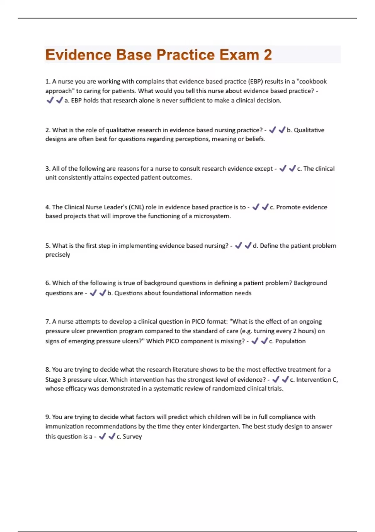 1. A nurse you are working with complains that evidence based practice (EBP) results in a "cookbook approach" to caring for patients. What would you tell this nurse about evidence based practice? - a. EBP holds that research alone is never sufficient to make a clinical decision. 2. What is the role of qualitative research in evidence based nursing practice? - b. Qualitative designs are often best for questions regarding perceptions, meaning or beliefs. 3. All of the following are reasons for a nurse to consult research evidence except - c. The clinical unit consistently attains expected patient outcomes. 4. The Clinical Nurse Leader's (CNL) role in evidence based practice is to - c. Promote evidence based projects that will improve the functioning of a microsystem. 5. What is the first step in implementing evidence based nursing? - d. Define the patient problem precisely 6. Which of the following is true of background questions in defining a patient problem? Background questions are - b. Questions about foundational information needs 7. A nurse attempts to develop a clinical question in PICO format: "What is the effect of an ongoing pressure ulcer prevention program compared to the standard of care (e.g. turning every 2 hours) on signs of emerging pressure ulcers?" Which PICO component is missing? - c. Population 8. You are trying to decide what the research literature shows to be the most effective treatment for a Stage 3 pressure ulcer. Which intervention has the strongest level of evidence? - c. Intervention C, whose efficacy was demonstrated in a systematic review of randomized clinical trials. 9. You are trying to decide what factors will predict which children will be in full compliance with immunization recommendations by the time they enter kindergarten. The best study design to answer this question is a - c. SurveyAs a CNL you are trying to gain an understanding of the leadership, staffing, values, safety issues and interruptions that characterize work on your microsystem. Which of the 5 Ps are you assessing? - d. Processes 11. A meta-analysis is a special type of systematic review in which - d. The statistical results of more than one study are combined 12. Which of the following is false? Clinical Practice Guidelines - b. Never make explicit recommendations to influence what clinicians do. 13. You want to search a database that will allow you to primarily focus on individual research studies done in nursing. The database you would choose would be - a. CINAHL 14. You want to search a database that focuses primarily on systematic reviews. The database you would choose would be - c. The Cochrane Library 15. Truncation is a method of searching for a word with multiple endings. Which of the following is the truncation symbol used in CINAHL? - d. Asterisk * 16. You are working in a community health setting. You want to look up some information for a new educational program you are preparing. Why might you choose to use Pubmed rather than another database? - c. Pubmed is freely available to anyone who has internet access. 17. What is the best thing to do first when you are searching and can't find any relevant articles? - a. Use broader terms or more general free text terms. 18. Which of the following is true of a systematic review? - c. Only studies which use the same type of design can be included 19. You are appraising a systematic review on drug therapy for migraine headaches. Which of the following would you consider to be inappropriate? - c. Authors are affiliated with the manufacturer of the leading anti-migraine medication20. You are appraising a systematic review on drug therapy for migraine headaches. The authors state that a study by Jones et al. was eliminated because participants in the intervention study group were offered ice bags or heating pads during a migraine attack in addition to the medication. No such additional therapy was offered to the control group. This elimination by the review authors was appropriate because the study by Jones et al. had a problem with - b. Performance bias 21. You are collecting data on pressure ulcer rates in your institution. What rate measures the number of people in your population who have a pressure ulcer at a given point in time? - c. Prevalence 22. Which of the following is true about the change process? - a. The leadership behavior of "selling" is an important strategy for change. 23. According to Lewin, the change concept of unfreezing refers to: - a. development of a need for change 24. The CNL is given the responsibility to oversee the implementation of a new electronic health record. He realizes that working with the new computer system will be stressful for the staff nurses. He is also aware that the staff does not view this change positively, but he is hoping, when they begin using the new system they will see the benefits. He helps them survive the stress of change by: - a. providing opportunities for them to talk about the system and provide support for each other. 25. The CNL has been on the unit for several months and begins to talk to the staff about implementing a new fall prevention program. The change being proposed is one which the staff reports has been tried before and didn't work out because it didn't work with the workflow pattern of the unit and didn't seem to address the root of the fall problem. Given this information, the CNL knows that the innovation might not be successfully adopted because of which characteristic? - b. Compatibility 26. Which of the following activities would be part of Lewin's stage of refreezing? - c. Developing performance standards and policies regarding the change. 27. A new computer system has been installed for charting and care planning. Two of the nurses have been putting up serious resistance such as complaining to other nurses and reporting computer failure. Which action by the CNL might be helpful in dealing with their resistance? - c. Talk to the two nurses; find out the r