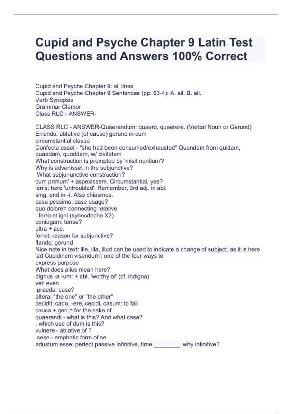 Cupid and Psyche Chapter 9 Latin Test Questions and Answers 100% Correct Cupid and Psyche Chapter 9 Latin Test Questions and Answers 100% Correct Cupid and Psyche Chapter 9 Latin Test Questions and Answers 100% Correct Cupid and Psyche Chapter 9: all lines Cupid and Psyche Chapter 9 Sentences (pp. 63-4): A. all. B. all. Verb Synopsis Grammar Clamor Class RLC - ANSWER- CLASS RLC - ANSWER-Quaerendum: quaero, quaerere. (Verbal Noun or Gerund) Errando: ablative (of cause) gerund in cum circumstantial clause Confecta esset - "she had been consumed/exhausted" Quandam from quidam,