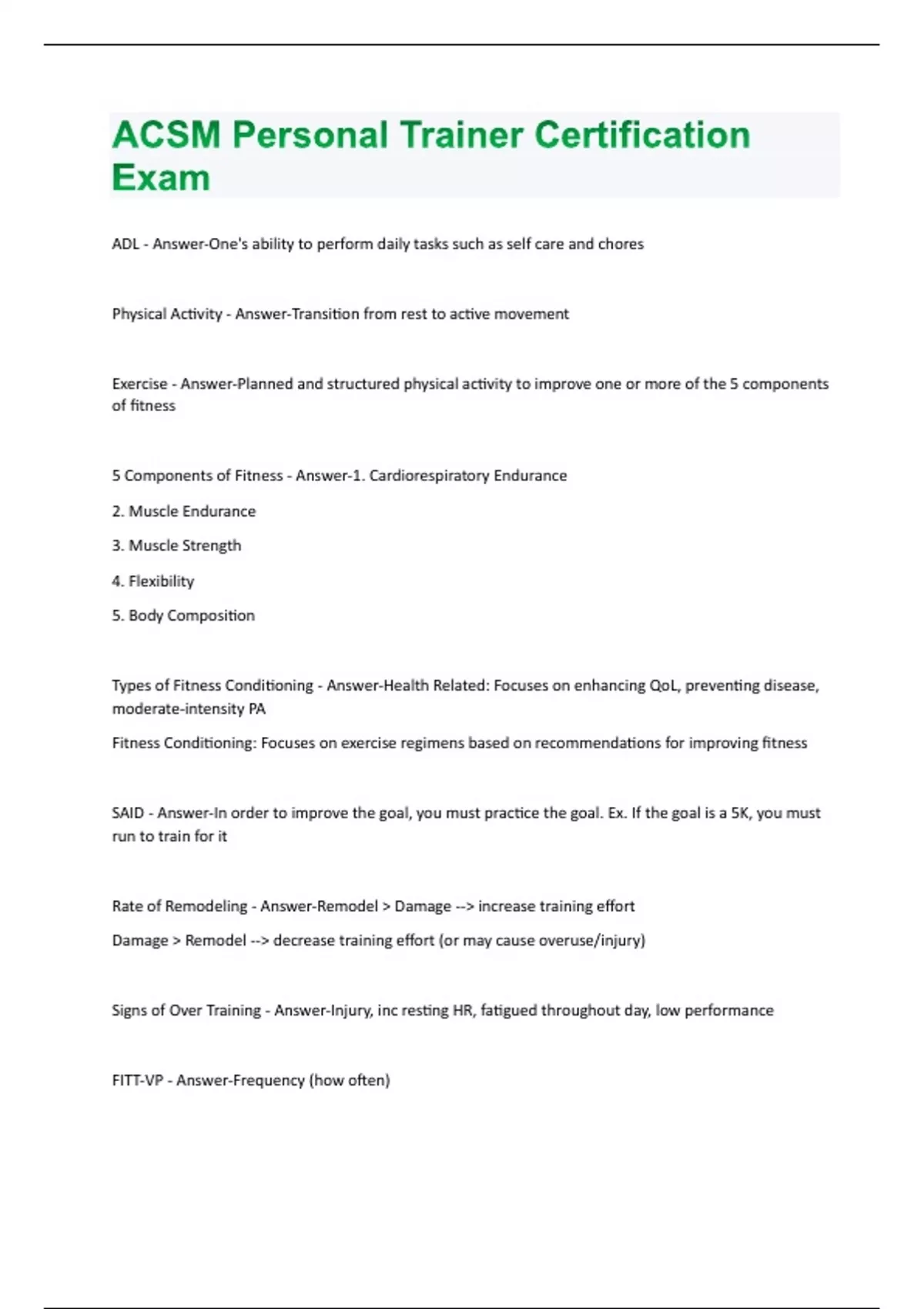 ADL - Answer-One's ability to perform daily tasks such as self care and chores Physical Activity - Answer-Transition from rest to active movement Exercise - Answer-Planned and structured physical activity to improve one or more of the 5 components of fitness 5 Components of Fitness - Answer-1. Cardiorespiratory Endurance 2. Muscle Endurance 3. Muscle Strength 4. Flexibility 5. Body Composition Types of Fitness Conditioning - Answer-Health Related: Focuses on enhancing QoL, preventing disease, moderate-intensity PA Fitness Conditioning: Focuses on exercise regimens based on recommendations for improving fitness SAID - Answer-In order to improve the goal, you must practice the goal. Ex. If the goal is a 5K, you must run to train for it Rate of Remodeling - Answer-Remodel > Damage --> increase training effort Damage > Remodel --> decrease training effort (or may cause overuse/injury) Signs of Over Training - Answer-Injury, inc resting HR, fatigued throughout day, low performance FITT-VP - Answer-Frequency (how often)Intensity (how hard) Time (duration) Type (mode) Volume (overall amount) Progression (how to advance) ATP-CP Phosphagen System - Answer-Anaerobic 0-30 sec high intensity work sprints, weight lifting Anaerobic Glycolysis/Lactic Acid - Answer-Anaerobic Glucose & lactic acid :30-3 mins high intensity work 400-800m sprint, 100m swim Oxidation System - Answer-Fat oxidation 3+ minutes important for endurance capacity limited by O2 and Cals available *Unfit client has decreased ability to deliver O2 from dec capillary density preventing delivery O2 Physiological Adaptations - Answer-1. Oxygen Deficit - initial stages of CV training bout referred to as lag in O2 consumption, relying on anaerobic metabolism 2. Steady State - achieved w/ sustained CV once O2 supplied equals O2 demanded. Inc fit, reach SS faster and endurance depends how long you stay here. 3. EPOC - O2 debt, uptake remained elevated post exercise for several minutes (or house if longer bout); EPOC effect is to restore CP/ATP in muscles and O2 in blood; "after burn" effect Sino Atrial Node - Answer-Pacemaker of the heart, in RA, initiates contractionAtrioventricular Node - Answer-Slows down the heart contracting Right Chambers - Answer-RA receives deoxy blood from vena cava. Blood travels to RV through tricuspid valve. Leaves RV via pulmonary semilunar valve to pulmonary system. Left Chambers - Answer-LA receives oxy blood from veins. Travels to LV through bicuspid valve then to aorta through the aortic semilunar valve where it then travels through the body's arteries to deliver oxygen. Pulse Sights - Answer-Carotid (not recommended to perform on someone) Brachial Femoral Radial (most recommended) Heart Rate - Answer-Avg is 72bpm resting (normal is 60-100bpm) Good gauge for clients to see how fit they are becoming Tachycardia/Bradychardia - Answer-Faster than normal heart rate, >100 bpm Slower than normal heart rate, < 60 bpm Stroke Volume (SV) - Answer-The amount of blood pumped from the left ventricle in one beat Cardiac Output (CO) - Answer-The amount of blood pumped from the heart in one minute Arteriovenous Oxygen Difference - Answer-Difference between oxygen content of arterial and venous blood Pulmonary Ventilation - Answer-Volume of air exchanged per minute VO2 Max - Answer-Highest rate and amount of O2 achieved at maximal physical exertionAcute CR Response to Aerobic Exercise - Answer-Increase: HR, SV, CO, AOD, BF, systolic BP, pulmonary ventilation, O2 consumption Chronic CR Adaptations to Aerobic Exercise - Answer-Decrease: RHR, BP, blood lactate Increase: SV, CO Synovial Joints - Answer-Freely movable allowing for variety of angular, circular, and specialized movements; most common type in human body Cardiac Muscle - Answer-involuntary muscle tissue Smooth Muscle - Answer-involuntary muscle tissue of arterial walls and organs of the body Skeletal Muscle - Answer-Voluntary muscle tissue made of striated fibers