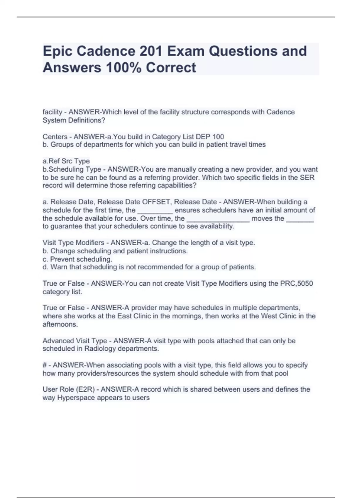 Epic Cadence 201 Exam Questions and Answers 100% CorrectEpic Cadence 201 Exam Questions and Answers 100% CorrectEpic Cadence 201 Exam Questions and Answers 100% CorrectEpic Cadence 201 Exam Questions and Answers 100% Correct facility - ANSWER-Which level of the facility structure corresponds with Cadence System Definitions? Centers - ANSWER-a.You build in Category List DEP 100 b. Groups of departments for which you can build in patient travel times a.Ref Src Type b.Scheduling Type - ANSWER-You are manually creating a new provider, and you want