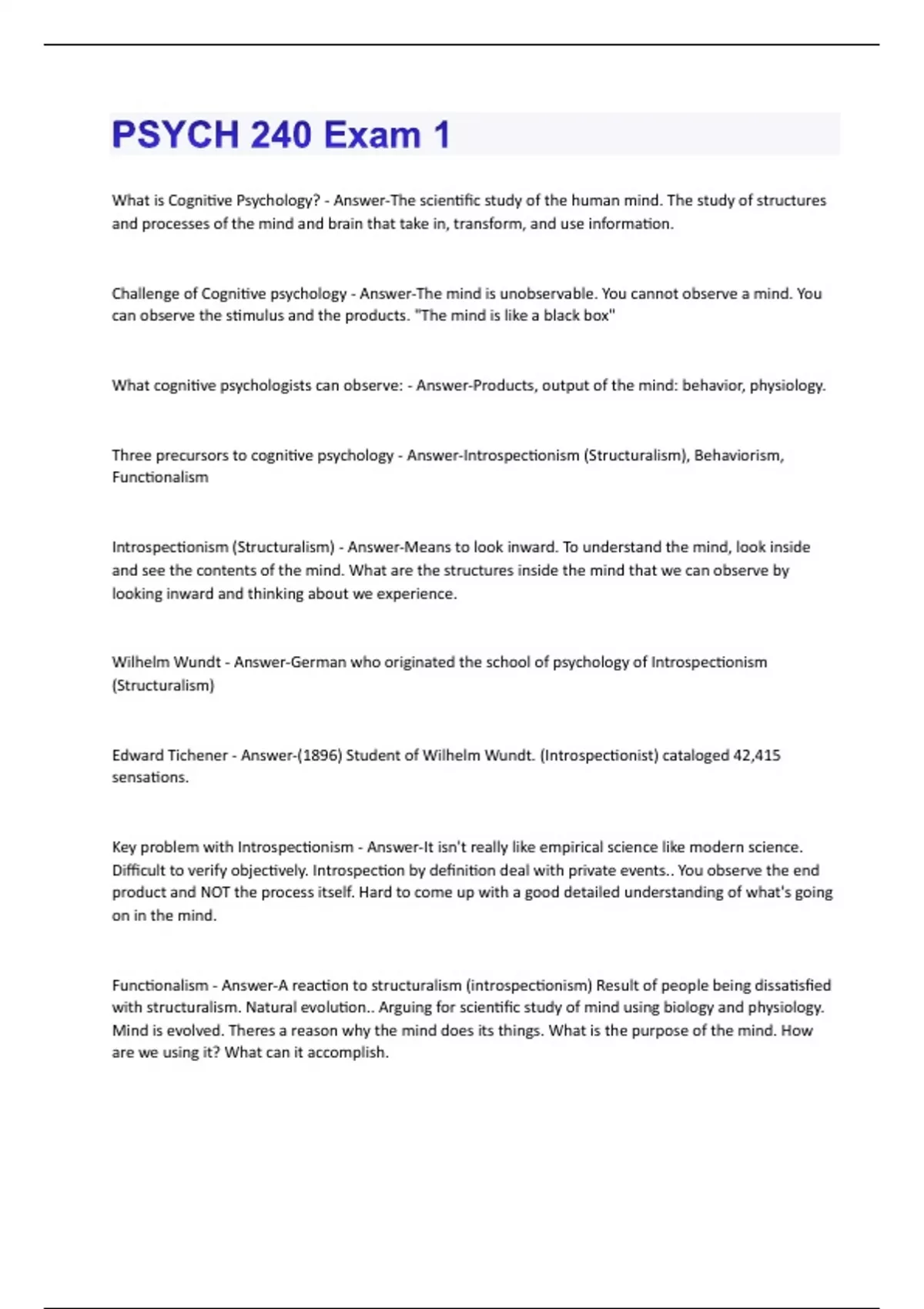 What is Cognitive Psychology? - Answer-The scientific study of the human mind. The study of structures and processes of the mind and brain that take in, transform, and use information. Challenge of Cognitive psychology - Answer-The mind is unobservable. You cannot observe a mind. You can observe the stimulus and the products. "The mind is like a black box" What cognitive psychologists can observe: - Answer-Products, output of the mind: behavior, physiology. Three precursors to cognitive psychology - Answer-Introspectionism (Structuralism), Behaviorism, Functionalism Introspectionism (Structuralism) - Answer-Means to look inward. To understand the mind, look inside and see the contents of the mind. What are the structures inside the mind that we can observe by looking inward and thinking about we experience. Wilhelm Wundt - Answer-German who originated the school of psychology of Introspectionism (Structuralism) Edward Tichener - Answer-(1896) Student of Wilhelm Wundt. (Introspectionist) cataloged 42,415 sensations. Key problem with Introspectionism - Answer-It isn't really like empirical science like modern science. Difficult to verify objectively. Introspection by definition deal with private events.. You observe the end product and NOT the process itself. Hard to come up with a good detailed understanding of what's going on in the mind. Functionalism - Answer-A reaction to structuralism (introspectionism) Result of people being dissatisfied with structuralism. Natural evolution.. Arguing for scientific study of mind using biology and physiology. Mind is evolved. Theres a reason why the mind does its things. What is the purpose of the mind. How are we using it? What can it accomplish.William James - Answer-(). Leader of functionalism movement. First person to distinguish between STM and LTM. John Dewey - Answer-Leader of Pragmatist school. Subset of Fundamentalism. Pragmatism - Answer-Put knowledge to use. Applied psychology. EDUCATION. Developing a practical use in the methods and ways of thinking of functionalist psychology. attribute of accepting the facts of life and favoring practicality and literal truth Progressive Education - Answer-Ideas and practices with the objective to make school teachings more effective for a democratic society. Behaviorism - Answer-Science of understanding behavior. Forget mind, mental processes. Trying to understand behavior. An approach to psychology that emphasizes observable measurable behavior. Dominant school of thought for the 20th century. Emphasis on what can be directly observed. Thirsty = "water deprived" operationally. Ivan Pavlov - Answer-Behaviorist. Discovered classical conditioning. John Watson - Answer-Pioneer of developing behaviorism. Systematic way of approaching psychology through behaviorist perspective. Behavior is all you need. You can understand between stimuli and responses (even complicated behaviors). Thinking is subvocal speech. founder of infomercials