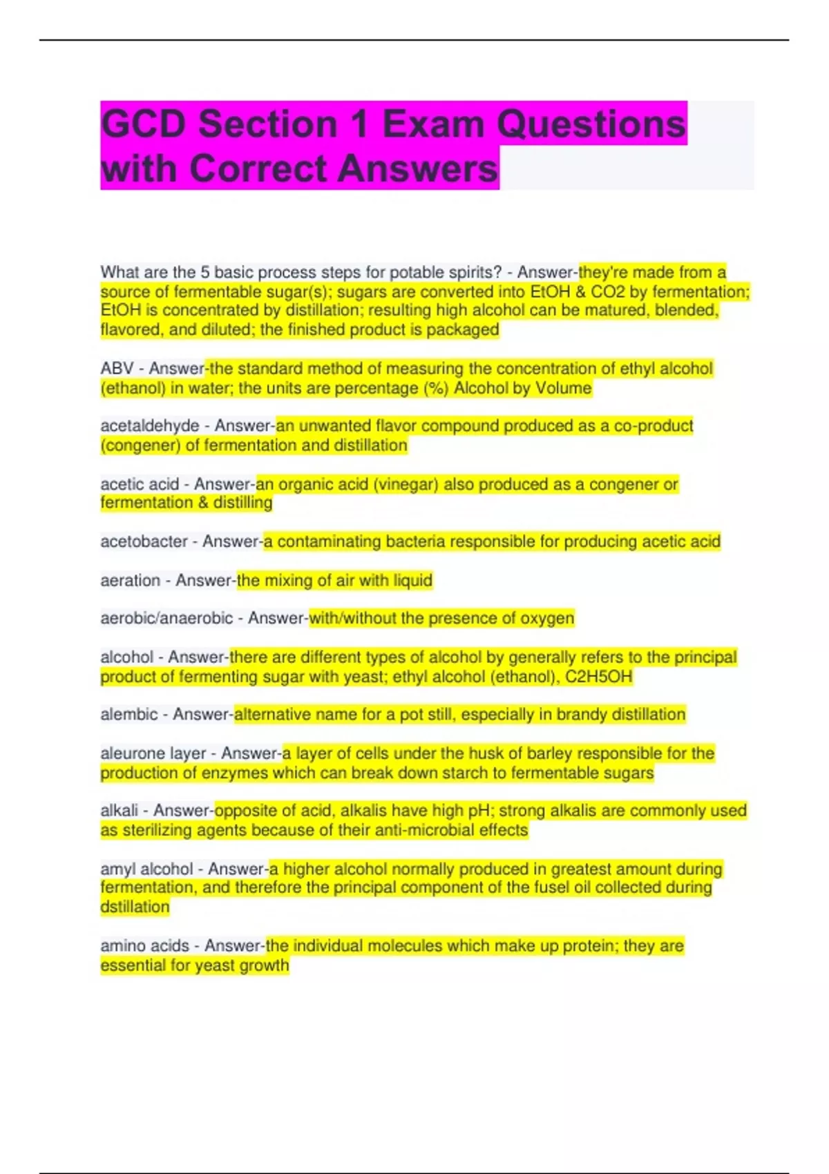 GCD Section 1 Exam Questions with Correct Answers What are the 5 basic process steps for potable spirits? - Answer-they're made from a source of fermentable sugar(s); sugars are converted into EtOH & CO2 by fermentation; EtOH is concentrated by distillation; resulting high alcohol can be matured, blended, flavored, and diluted; the finished product is packaged ABV - Answer-the standard method of measuring the concentration of ethyl alcohol (ethanol) in water; the units are percentage (%) Alcohol by Volume acetaldehyde - Answer-an unwanted flavor compound produced as a co-product (congener) of fermentation and distillation acetic acid - Answer-an organic acid (vinegar) also produced as a congener or fermentation & distilling acetobacter - Answer-a contaminating bacteria responsible for producing acetic acid aeration - Answer-the mixing of air with liquid aerobic/anaerobic - Answer-with/without the presence of oxygen alcohol - Answer-there are different types of alcohol by generally refers to the principal product of fermenting sugar with yeast; ethyl alcohol (ethanol), C2H5OH alembic - Answer-alternative name for a pot still, especially in brandy distillation aleurone layer - Answer-a layer of cells under the husk of barley responsible for the production of enzymes which can break down starch to fermentable sugars alkali - Answer-opposite of acid, alkalis have high pH; strong alkalis are commonly used as sterilizing agents because of their anti-microbial effects amyl alcohol - Answer-a higher alcohol normally produced in greatest amount during fermentation, and therefore the principal component of the fusel oil collected during dstillation amino acids - Answer-the individual molecules which make up protein; they are essential for yeast growth