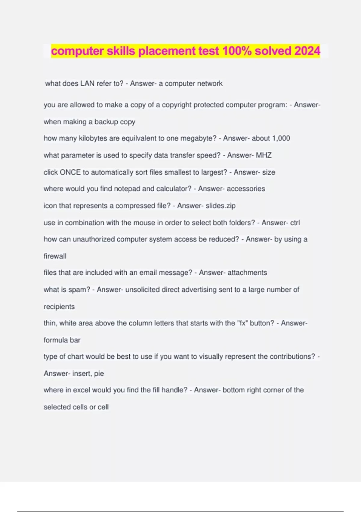 computer skills placement test 100% solved 2024 what does LAN refer to? - Answer- a computer network you are allowed to make a copy of a copyright protected computer program: - Answer- when making a backup copy how many kilobytes are equilvalent to one megabyte? - Answer- about 1,000 what parameter is used to specify data transfer speed? - Answer- MHZ click ONCE to automatically sort files smallest to largest? - Answer- size where would you find notepad and calculator? - Answer- accessories icon that represents a compressed file? - Answer- use in combination with the mouse in order to select both folders? - Answer- ctrl how can unauthorized computer system access be reduced? - Answer- by using a firewall files that are included with an email message? - Answer- attachments what is spam? - Answer- unsolicited direct advertising sent to a large number of recipients thin, white area above the column letters that starts with the "fx" button? - Answer- formula bar type of chart would be best to use if you want to visually represent the contributions? - Answer- insert, pie where in excel would you find the fill handle? - Answer- bottom right corner of the selected cells or cell which button will immediately calculate the total cost? - Answer- sum function also known as AutoSum (home button) which button merges and centers cells? - Answer- merge and center selected word to fly in from the left? - Answer- animations, fly in, effect options add special graphical object: process, cycle, or hierarchy? - Answer- press insert, then smartart how to start slideshow? - Answer- press projector button or press F5. make sure start from beginning is checked. add a logo at the bottom of each slide and change all the bullets, which powerpoint feature will allow this? - Answer- slide master which key creates a new paragraph? - Answer- enter which button can be dragged to control the first-line indent of a paragraph? - Answer- curser button which button allows you to change the line spacing? - Answer- paragraph box, 0.5, 1, 2 right align the contents of the selected column? - Answer- press the right alignment button substitute the occurrence of the word? - Answer- replace Which of the following should you use if you want all of the slides in the presentation to have the same "look"? - Answer- a presentation design template In Microsoft PowerPoint two kind of sound effects files that can be added to the presentation are - Answer- .wav files and .mid files What is a motion path? - Answer- A method of moving items on a