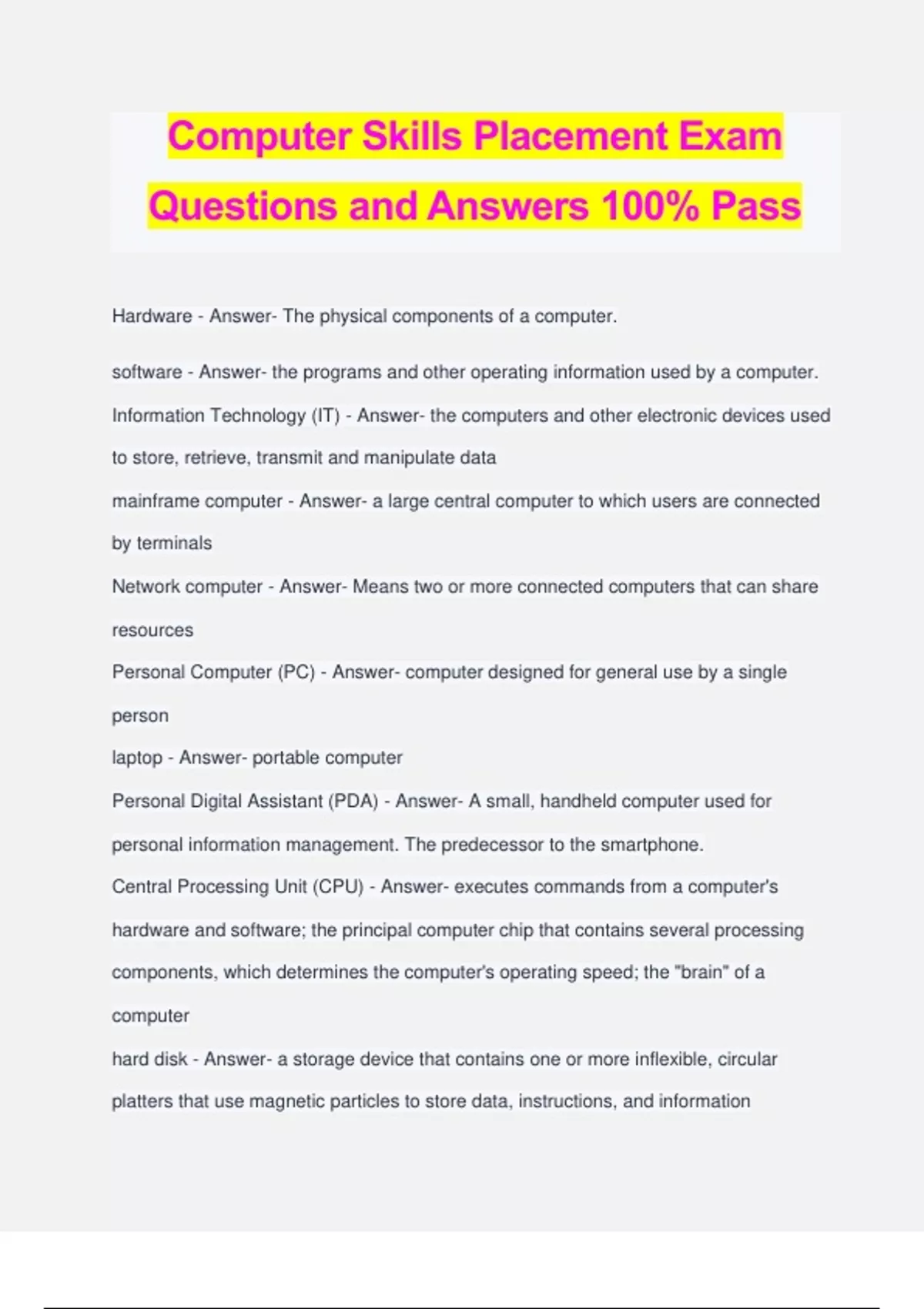 Computer Skills Placement Exam Questions and Answers 100% Pass Hardware - Answer- The physical components of a computer. software - Answer- the programs and other operating information used by a computer. Information Technology (IT) - Answer- the computers and other electronic devices used to store, retrieve, transmit and manipulate data mainframe computer - Answer- a large central computer to which users are connected by terminals Network computer - Answer- Means two or more connected computers that can share resources Personal Computer (PC) - Answer- computer designed for general use by a single person laptop - Answer- portable computer Personal Digital Assistant (PDA) - Answer- A small, handheld computer used for personal information management. The predecessor to the smartphone. Central Processing Unit (CPU) - Answer- executes commands from a computer's hardware and software; the principal computer chip that contains several processing components, which determines the computer's operating speed; the "brain" of a computer hard disk - Answer- a storage device that contains one or more inflexible, circular platters that use magnetic particles to store data, instructions, and information input device - Answer- A device used to enter information into a computer. output device - Answer- allows the user to view or listen to the data a computer processes such as a monitor, printer, headphones, or speakers computer memory - Answer- any physical device capable of storing information temporarily or permanently Random Access Memory (RAM) - Answer- Computer location where instructions and data are stored on a temporary basis. This memory is volatile. read-only memory (ROM) - Answer- A type of memory that contains data that is retrievable but cannot be changed. bit - Answer- A contraction of "Binary Digit"; the single unit of information in a computer, typically represented as a 0 or 1 Byte - Answer- a group of 8 bits Kilobyte (KB) - Answer- A unit of computer storage equal to approximately one thousand bytes. Megabyte (MB) - Answer- a unit of storage measuring roughly one million bytes Gigabyte (GB) - Answer- a unit of storage measuring roughly one billion bytes Terabyte (TB) - Answer- a unit of storage measuring roughly one trillion bytes keyboard - Answer- An input device that enters data with letters, numbers, symbols, and special function keys. mouse - Answer- a hand-operated electronic device that controls the coordinates of a cursor on your computer screen as you move it around on a pad trackball - Answer- An input device that has the rolling ball on the top. It is used to move the cursor and select items on a computer screen.