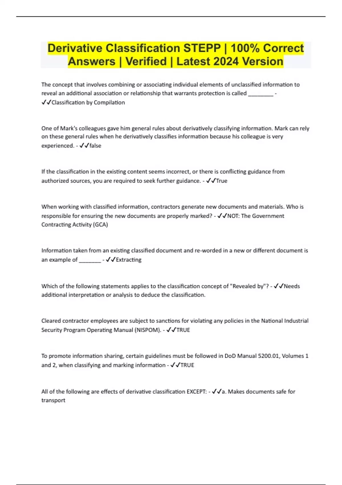Derivative Classification STEPP | 100% Correct Answers | Verified | Latest 2024 Version