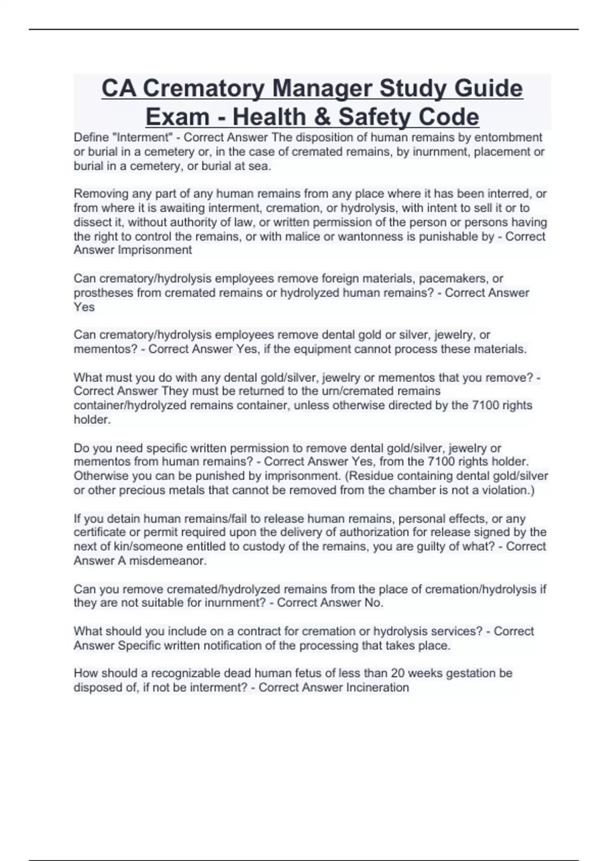 CA Crematory Manager Study Guide Exam - Health & Safety Code