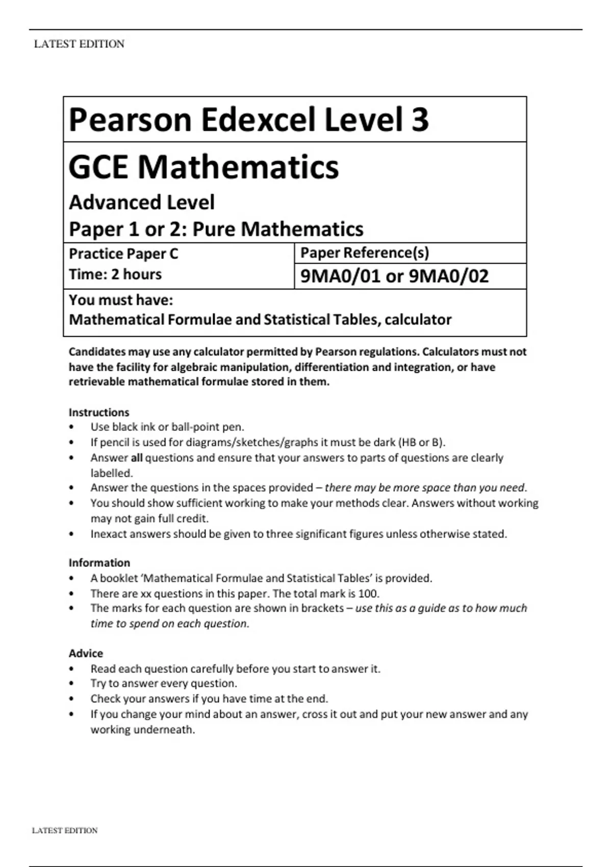 Pearson Edexcel Level 3 GCE Mathematics Advanced Level Paper 1 or 2: Pure Mathematics