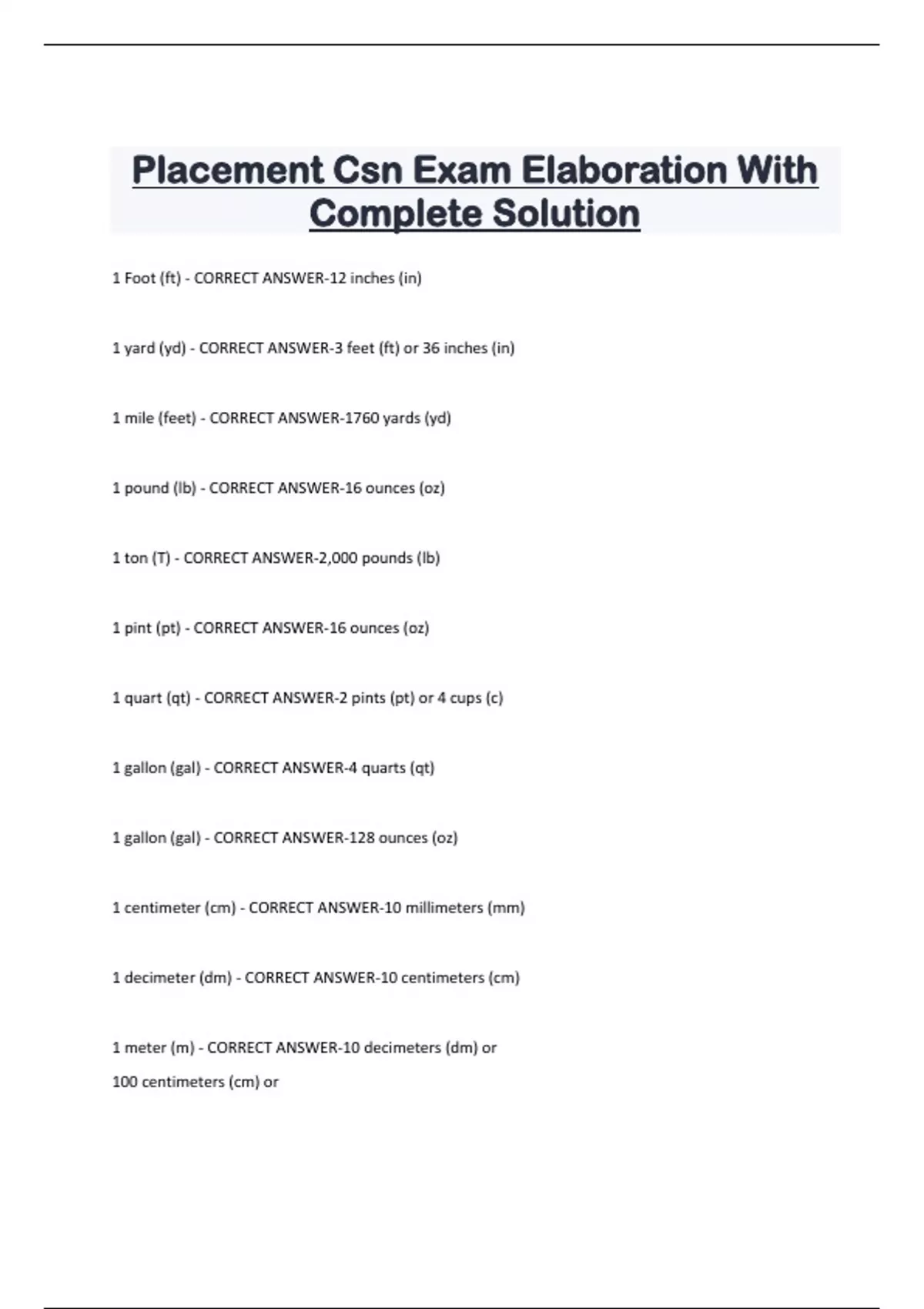 Placement Csn Exam Elaboration With Complete Solution 1 Foot (ft) - CORRECT ANSWER-12 inches (in) 1 yard (yd) - CORRECT ANSWER-3 feet (ft) or 36 inches (in) 1 mile (feet) - CORRECT ANSWER-1760 yards (yd) 1 pound (lb) - CORRECT ANSWER-16 ounces (oz