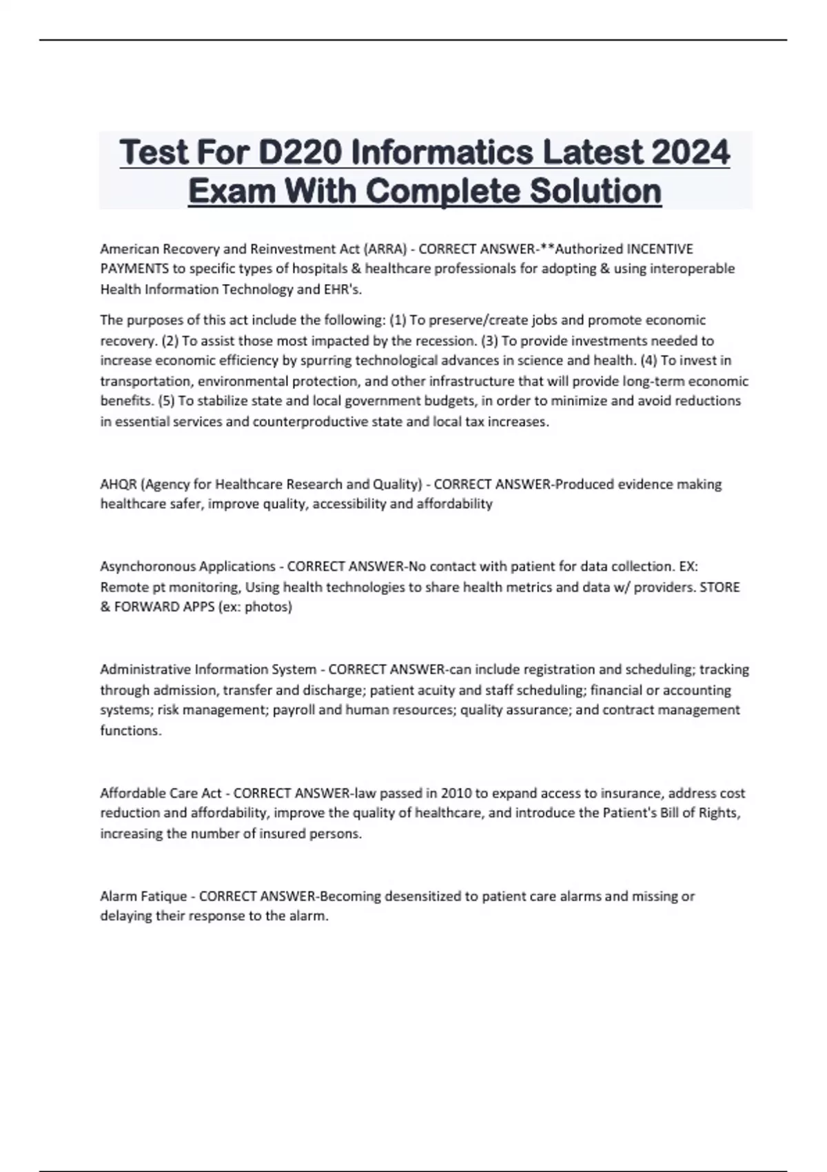 Test For D220 Informatics Latest 2024 Exam With Complete Solution American Recovery and Reinvestment Act (ARRA) - CORRECT ANSWER-**Authorized INCENTIVE PAYMENTS to specific types of hospitals & healthcare professionals for adopting & using interoperable Health Information Technology and EHR's. The purposes of this act include the following: (1) To preserve/create jobs and promote economic recovery. (2) To assist those most impacted by the recession. (3) To provide investments needed to increase economic efficiency by spurring technological advances in science and health. (4) To invest in transportation, environmental protection, and other infrastructure that will provide long-term economic benefits. (5) To stabilize state and local government budgets, in order to minimize and avoid reductions in essential services and counterproductive state and local tax increases.