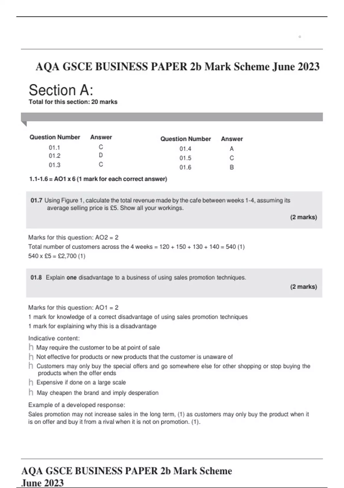 AQA GSCE BUSINESS PAPER 2b Mark Scheme June 2023