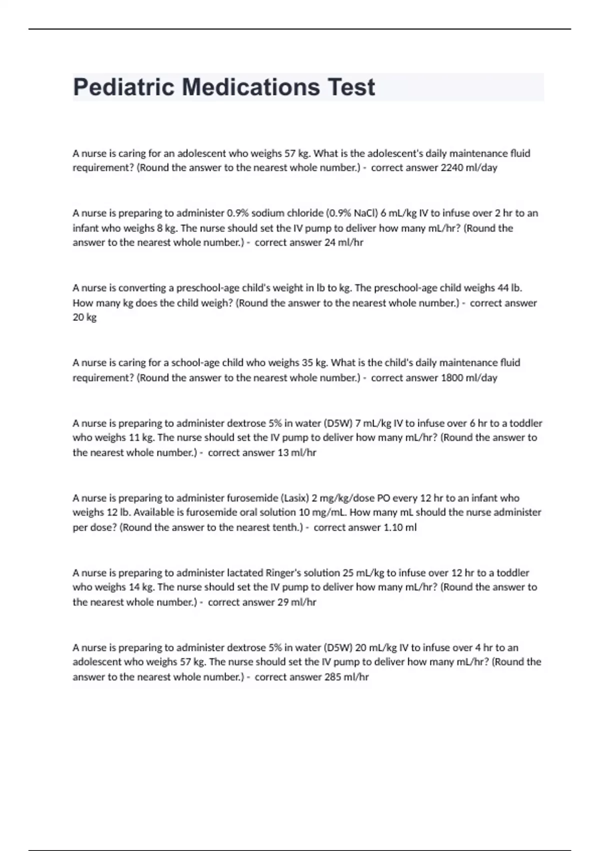 pediatric medications test questions and answers v