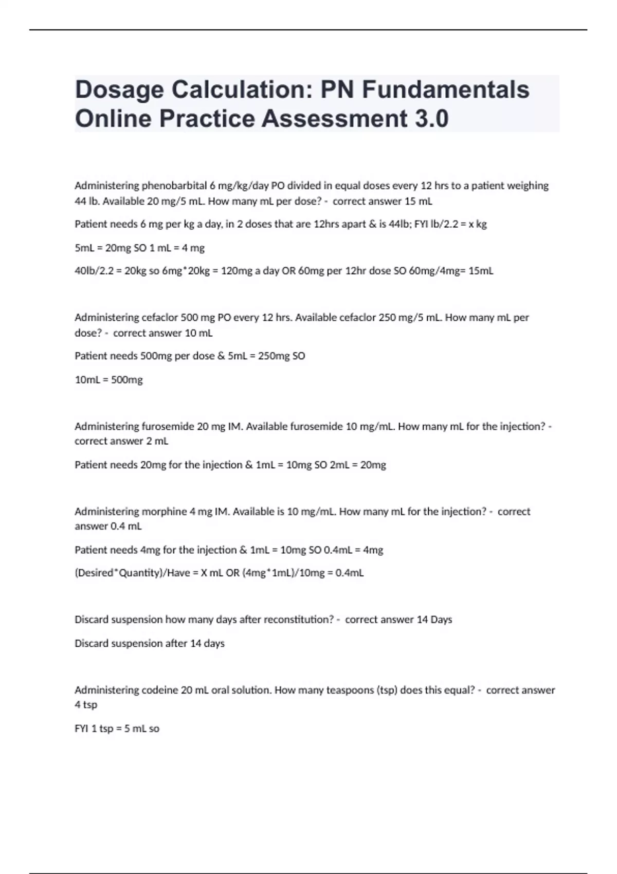 Dosage Calculation PN Fundamentals Online Practice Assessment 3.0 questions and answers already certified 2024