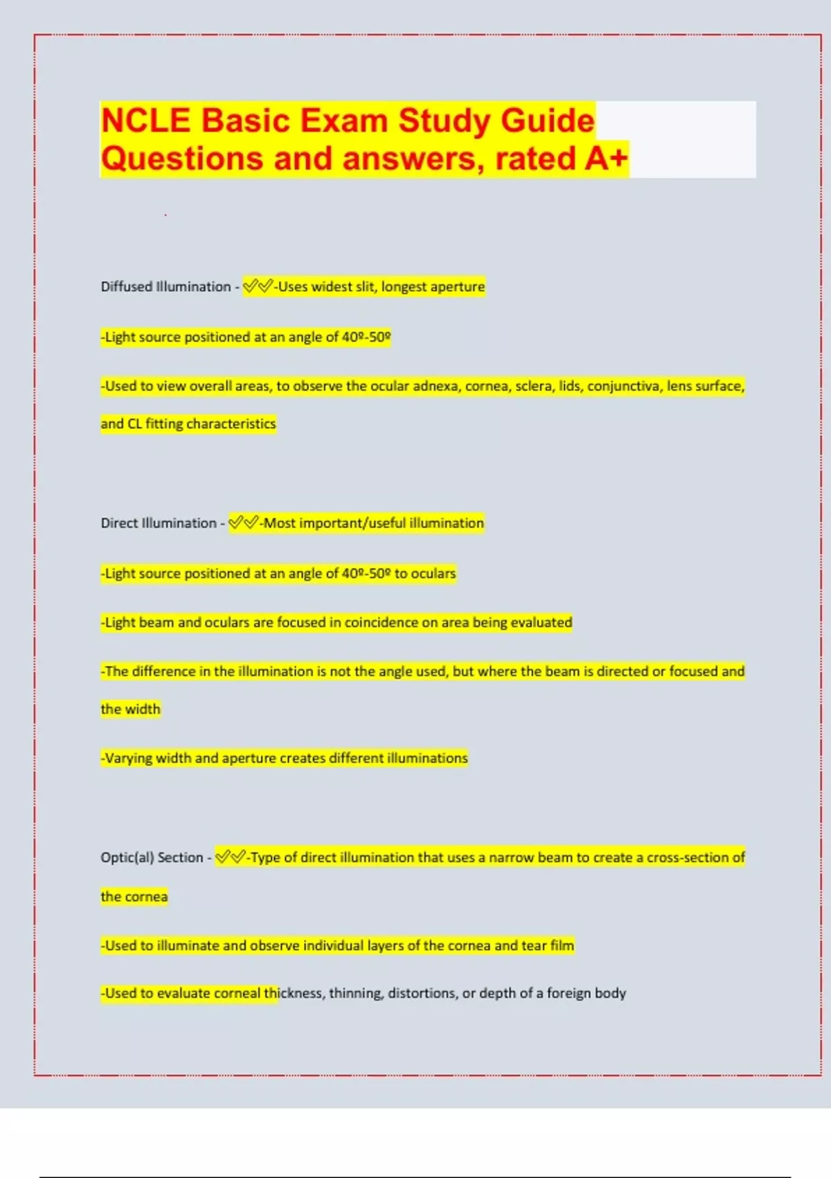 NCLE Basic Exam Study Guide Questions and answers, rated A+ Diffused Illumination - -Uses widest slit, longest aperture -Light source positioned at an angle of 40º-50º -Used to view overall areas, to observe the ocular adnexa, cornea, sclera, lids, conjunctiva, lens surface, and CL fitting characteristics Direct Illumination - -Most important/useful illumination -Light source positioned at an angle of 40º-50º to oculars -Light beam and oculars are focused in coincidence on area being evaluated -The difference in the illumination is not the angle used, but where the beam is directed or focused and the width -Varying width and aperture creates different illuminations Optic(al) Section - -Type of direct illumination that uses a narrow beam to create a cross-section of the cornea -Used to illuminate and observe individual layers of the cornea and tear film -Used to evaluate corneal thickness, thinning, distortions, or depth of a foreign body -Shows corneal-lens relationship Parallelepiped - -Type of direct illumination -Uses a 0.5-3.0 mm beam and a 40º-50º angle to create a 3-D cube -Used to assess width, depth, and height of an object within the cornea -Useful in observing scars, infiltrates, staining, and the corneal-lens relationship Indirect Illumination - -Light source is moved out-of-click, the beam is 2-3 mm wide and is positioned next to the area being studied -Illuminated area is translucent or opaque, allowing for observation adjacent to illumination -Used to observe foreign bodies, corneal nerves, and opacities -Oscillation of light accentuates details Retroillumination - -Light source is out-of-click, moved to the side of the area being observed -Using a 1-3 mm beam, the light is reflected off the iris and used to back-light the area studied -Useful in examining corneal scars, debris, microcysts, scratches on the lens, sub-epithelial changes, corneal vascularization, diffuse edema, and surface deposits Sclerotic Scatter - -Uses a focused parellelepiped placed out-of-click directed at the limbus -Oculars are not used