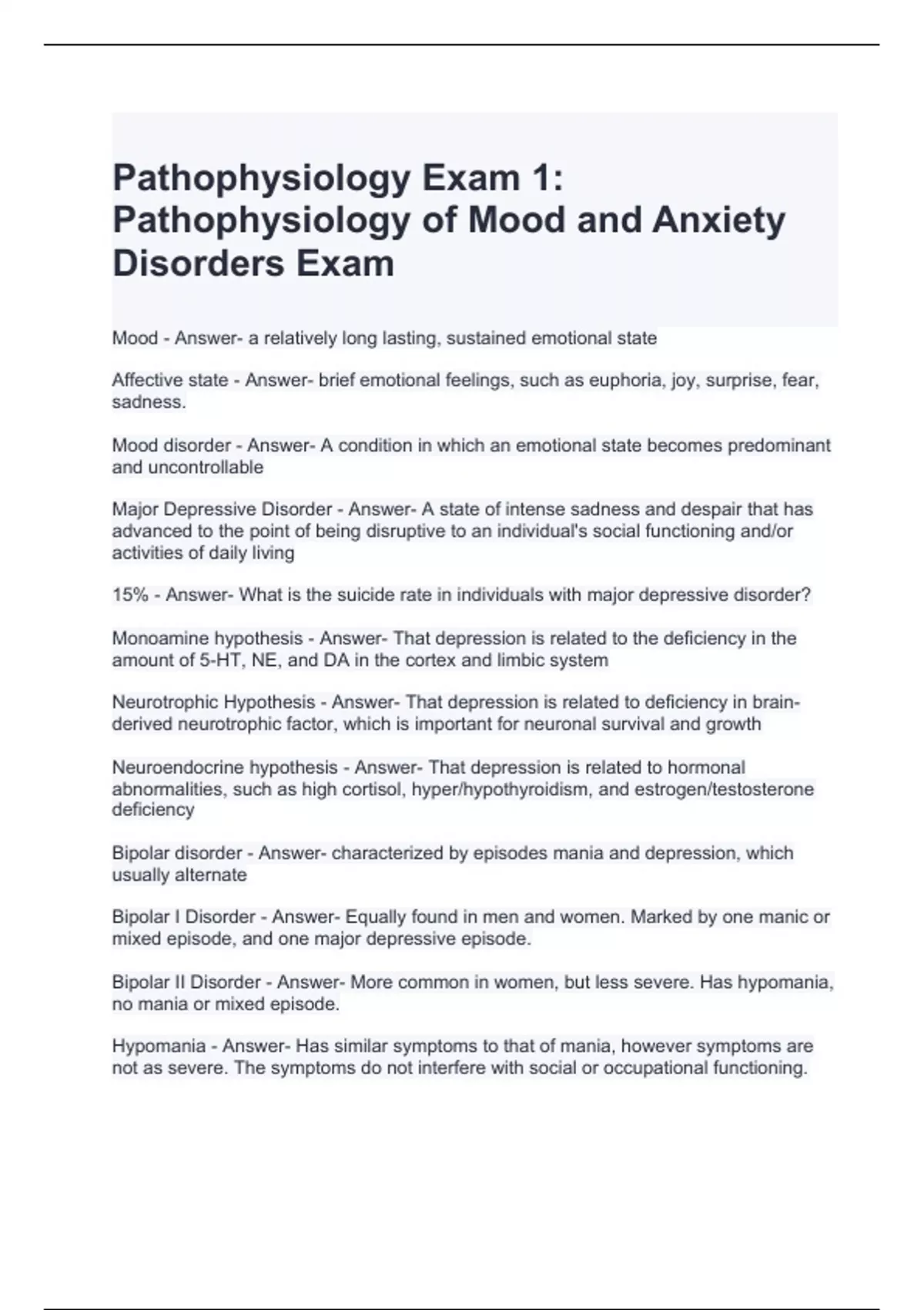 Pathophysiology Exam 1 Pathophysiology of Mood and Anxiety Disorders Exam 2024