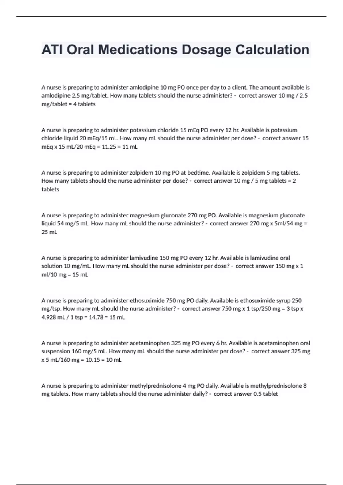 ATI Oral Medications Dosage Calculation. questions and answers already passed 2024