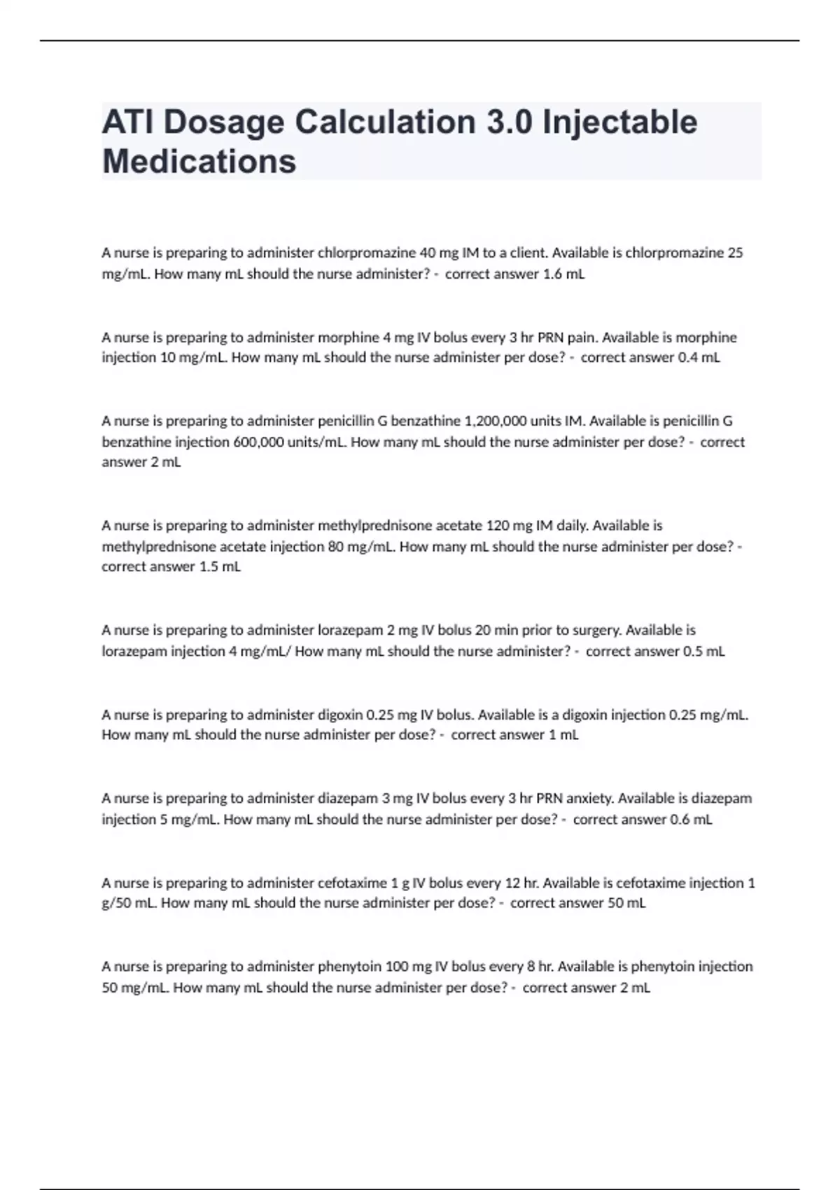 ATI Dosage Calculation 3.0 Injectable Medications questions and answers verified 2024