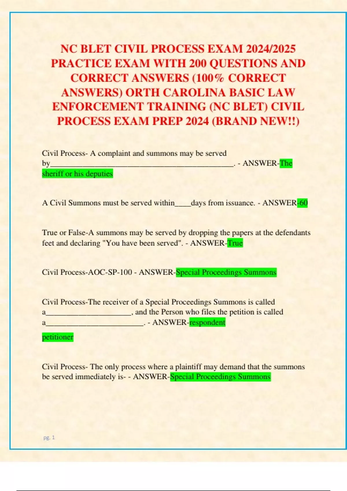 NC BLET CIVIL PROCESS EXAM 2024/2025 PRACTICE EXAM WITH 200 QUESTIONS AND CORRECT ANSWERS (100% CORRECT ANSWERS) NORTH CAROLINA BASIC LAW ENFORCEMENT TRAINING (NC BLET) CIVIL PROCESS EXAM PREP 2024 (BRAND NEW!!)
