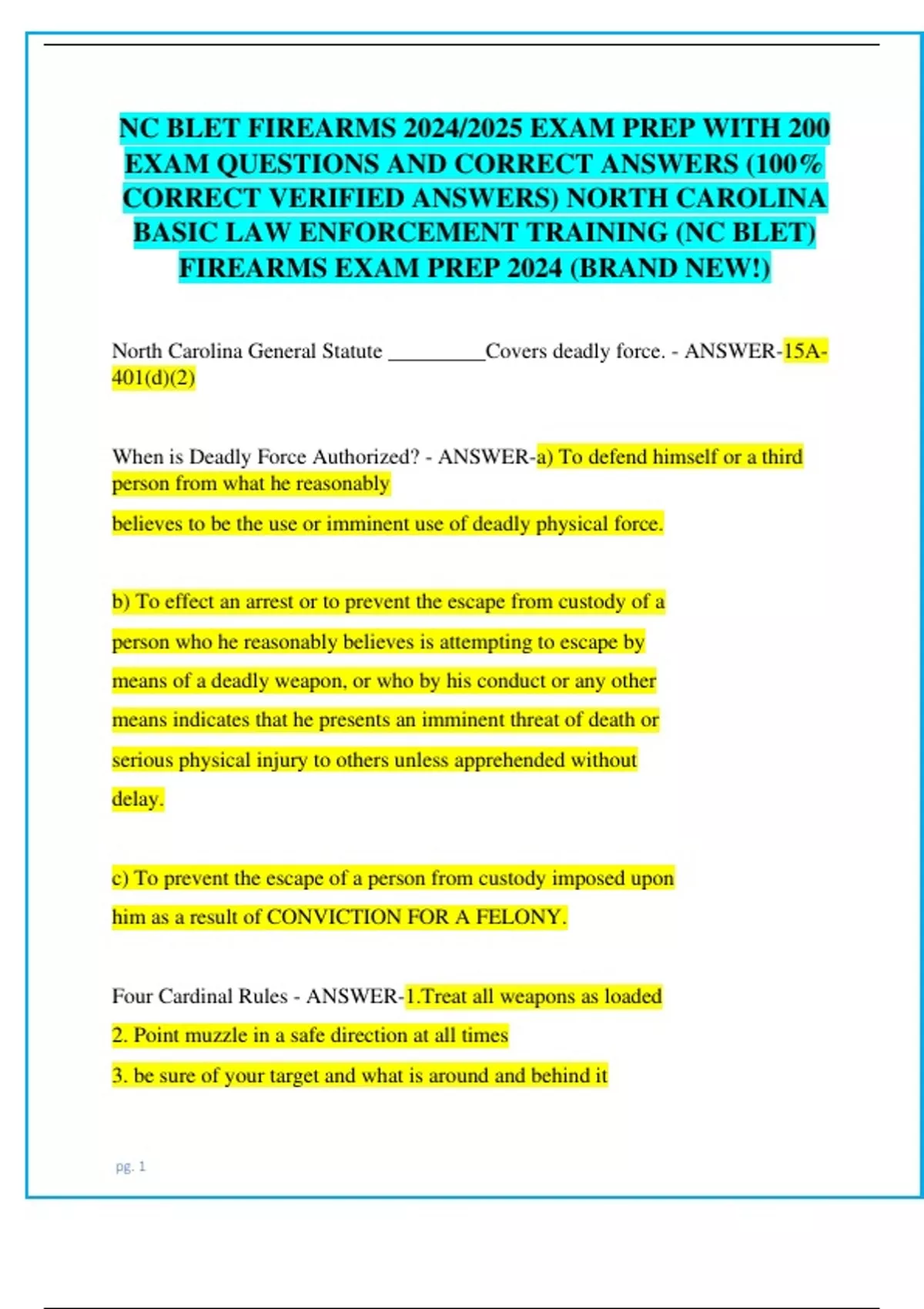 NC BLET FIREARMS 2024/2025 EXAM PREP WITH 200 EXAM QUESTIONS AND CORRECT ANSWERS (100% CORRECT VERIFIED ANSWERS) NORTH CAROLINA BASIC LAW ENFORCEMENT TRAINING (NC BLET) FIREARMS EXAM PREP 2024 (BRAND NEW!)