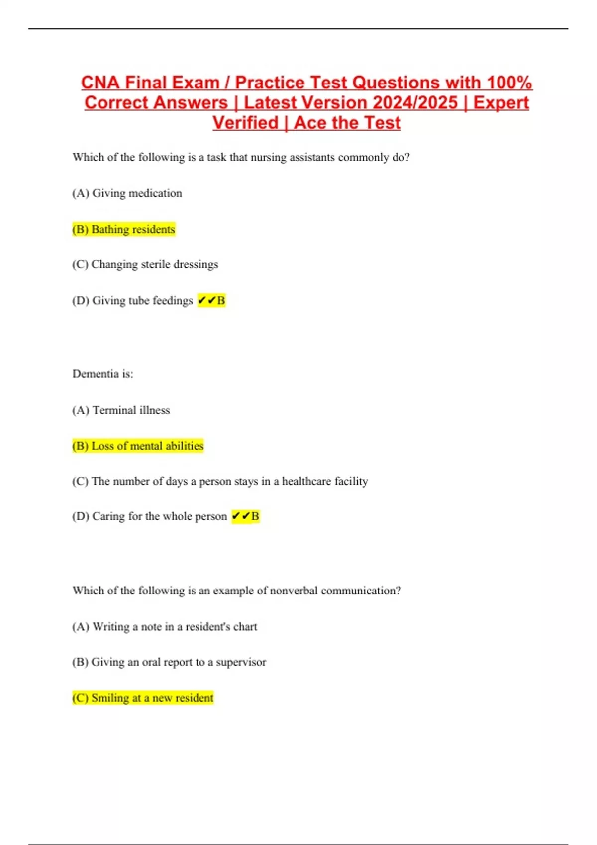 CNA Final Exam / Practice Test Questions with 100% Correct Answers | Latest Version 2024/2025 | Expert Verified | Ace the Test