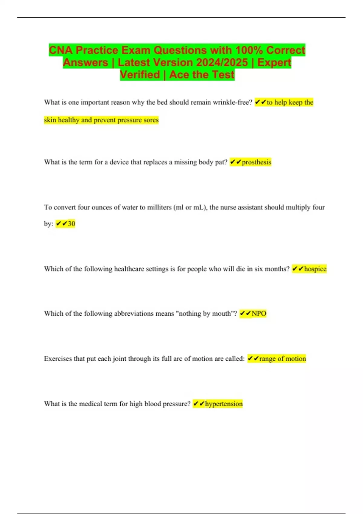 CNA Practice Exam Questions with 100% Correct Answers | Latest Version 2024/2025 | Expert Verified | Ace the Test