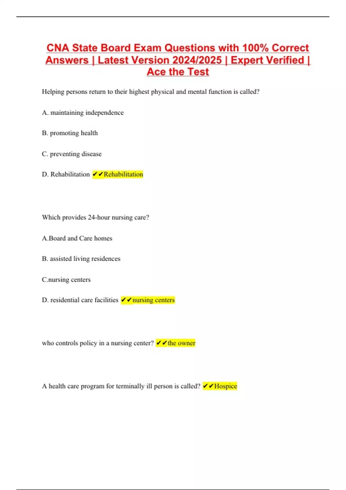 CNA State Board Exam Questions with 100% Correct Answers | Latest Version 2024/2025 | Expert Verified | Ace the Test