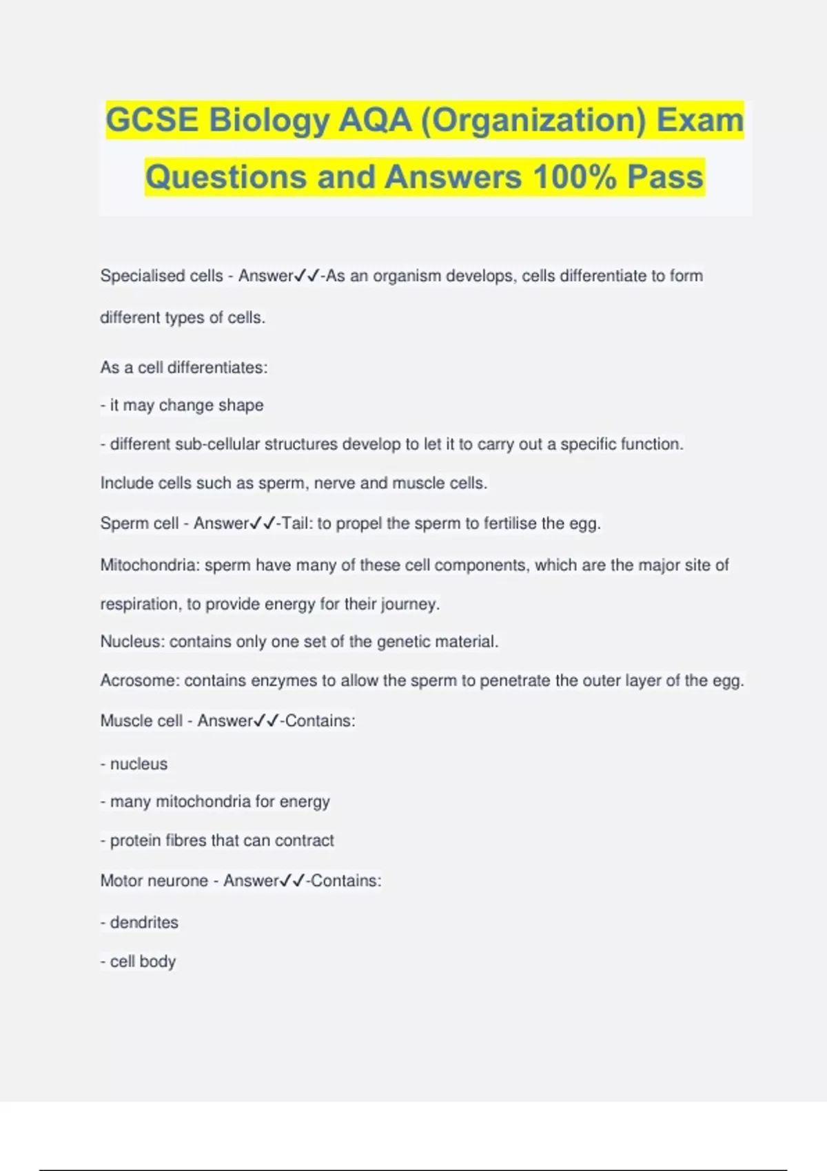 GCSE Biology AQA (Organization) Exam Questions and Answers 100% Pass Specialised cells - Answer️️ -As an organism develops, cells differentiate to form different types of cells. As a cell differentiates: - it may change shape - different sub-cellular structures develop to let it to carry out a specific function. Include cells such as sperm, nerve and muscle cells. Sperm cell - Answer️️ -Tail: to propel the sperm to fertilise the egg. Mitochondria: sperm have many of these cell components, which are the major site of respiration, to provide energy for their journey. Nucleus: contains only one set of the genetic material. Acrosome: contains enzymes to allow the sperm to penetrate the outer layer of the egg. Muscle cell - Answer️️ -Contains: - nucleus - many mitochondria for energy - protein fibres that can contract Motor neurone - Answer️️ -Contains: - dendrites - cell body - axon - sheath (acts as an insulator) Xylem cell - Answer️️ -The cells are arranged end to end but the end walls break down to form hollow tubes. The cell wall of the cell is strengthened by a substance called lignin. Phloem cell - Answer️️ -The end wall of the cells allow sugars through but support the tubes. The cells are arranged end to end into tubes. Contain companion cells. Root hair cell - Answer️️ -Lots of mitochondria for active transport of minerals. Long projection to increase the surface area to absorb water and minerals. Tissue - Answer️️ -A group of cells with a similar structure and function, which all work together to do a job. Examples of tissues - Answer️️ -- muscle tissue contracts to produce movement - glandular tissue produces substances such as enzymes and hormones - epithelial tissue covers organs Organs - Answer️️ -Groups of different tissues, which all work together to perform a specific job. Each may contain several tissues. Stomach - Answer️️ -An organ that contains: - muscle tissue that contracts to churn the contents - glandular tissue to produce digestive juices - epithelial tissue to cover the outside and insid