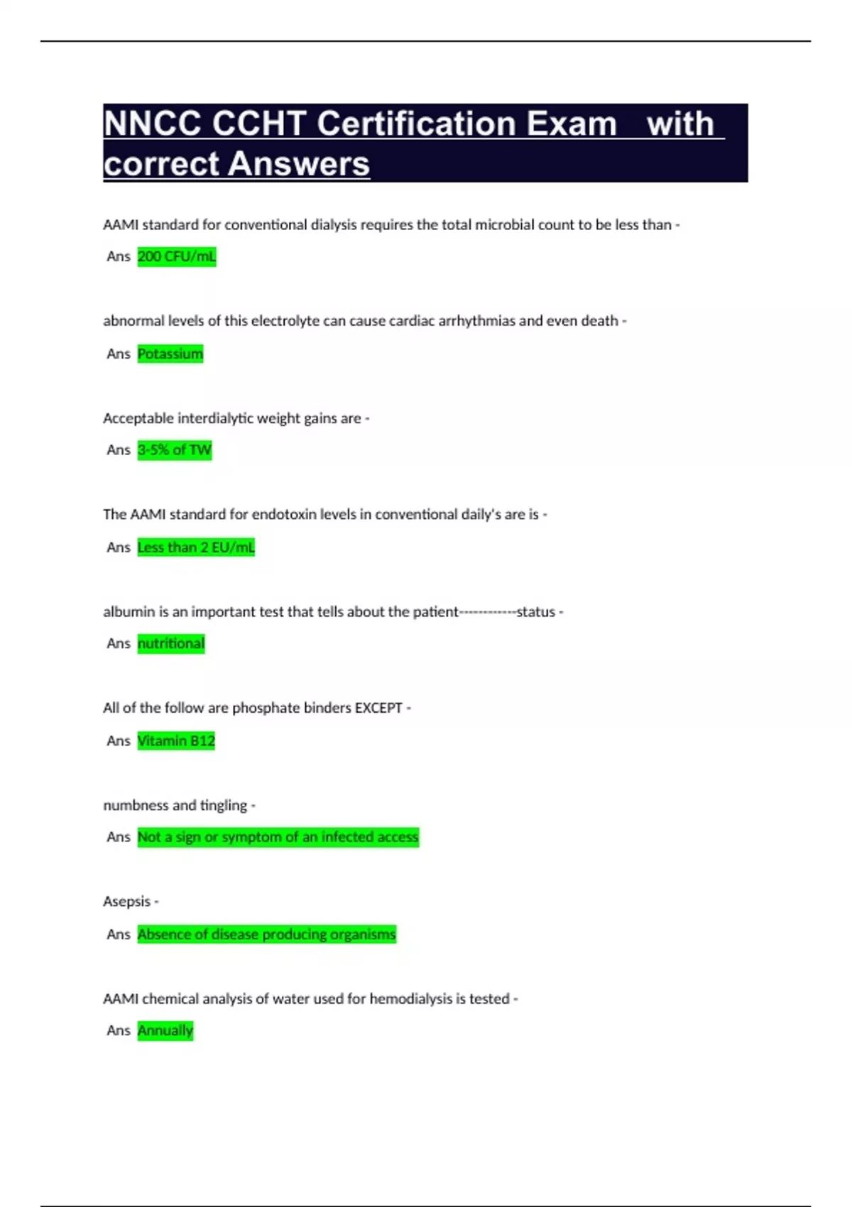 nncc ccht certification exam with correct answers