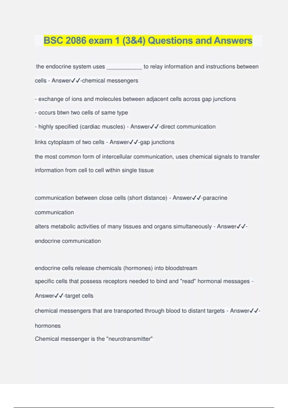 BSC 2086 exam 1 (3&4) Questions and Answers the endocrine system uses ___________ to relay information and instructions between cells - Answer️️ -chemical messengers - exchange of ions and molecules between adjacent cells across gap junctions - occurs btwn two cells of same type - highly specified (cardiac muscles) - Answer️️ -direct communication links cytoplasm of two cells - Answer️️ -gap junctions the most common form of intercellular communication, uses chemical signals to transfer information from cell to cell within single tissue communication between close cells (short distance) - Answer️️ -paracrine communication alters metabolic activities of many tissues and organs simultaneously - Answer️️ - endocrine communication endocrine cells release chemicals (hormones) into bloodstream specific cells that possess receptors needed to bind and "read" hormonal messages - Answer️️ -target cells chemical messengers that are transported through blood to distant targets - Answer️️ - hormones Chemical messenger is the "neurotransmitter" Ideal for crisis management Occurs across synaptic clefts (short distances) Limited to a very specific area Response usually not long lasting Nervous system response faster than endocrine system - Answer️️ -synaptic communication T or F paracrine factors can enter the bloodstream, however their concentrations are usually too low to affect distant cells/tissues - Answer️️ -true epinephrine and norepinephrine are both released from the - Answer️️ -adrenal medullae of adrenal glands biogenic amines aka - Answer️️ -amino acid derivatives melatonin is produced from - Answer️️ -pineal gland