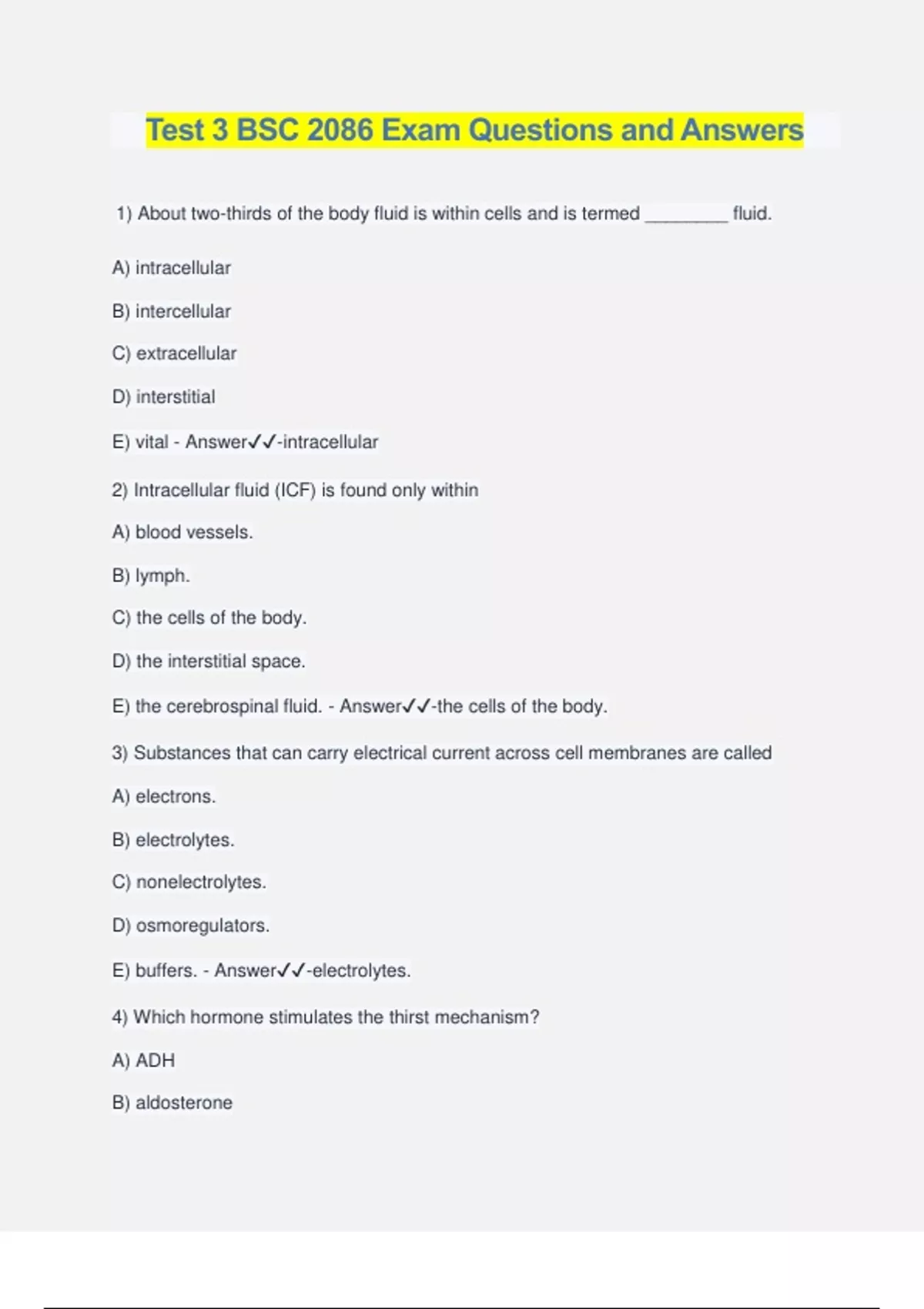 Test 3 BSC 2086 Exam Questions and Answers 1) About two-thirds of the body fluid is within cells and is termed ________ fluid. A) intracellular B) intercellular C) extracellular D) interstitial E) vital - Answer️️ -intracellular 2) Intracellular fluid (ICF) is found only within A) blood vessels. B) lymph. C) the cells of the body. D) the interstitial space. E) the cerebrospinal fluid. - Answer️️ -the cells of the body. 3) Substances that can carry electrical current across cell membranes are called A) electrons. B) electrolytes. C) nonelectrolytes. D) osmoregulators. E) buffers. - Answer️️ -electrolytes. 4) Which hormone stimulates the thirst mechanism? A) ADH B) aldosterone C) BNP D) ANP E) epinephrine - Answer️️ -ADH 5) In an adult female, the body consists of about ________ percent water. A) 60 B) 50 C) 40 D) 70 E) 80 - Answer️️ -50 6) All of the following are components of ECF, except A) cerebrospinal fluid. B) peritoneal fluid. C) lymph. D) aqueous humor. E) RBCs. - Answer️️ -RBCs 7) The extracellular fluid (ECF) consists of the A) plasma. B) interstitial fluid. C) cerebrospinal fluid. D) lymph. E) All of the answers are correct. - Answer️️ -All of the answers are correct. 8) In a lean adult male, the body consists of about ________ percent water. A) 60 B) 90 C) 40 D) 10 E) 80 - Answer️️ -60 9) The principal cation in intracellular fluid is A) sodium. B) potassium. C) calcium. D) magnesium. E) chloride. - Answer️️ -potassium 10) Which of the following will stimulate thirst? A) drying the mucosa of the mouth and pharynx B) angiotensin II acting on the hypothalamus C) an increase in the osmotic pressure of interstitial fluid within the hypothalamus D) stimulation of osmoreceptors E) All of the answers are correct. - Answer️️ -All of the answers are correct. 11) The ions in highest concentration in the intracellular fluid