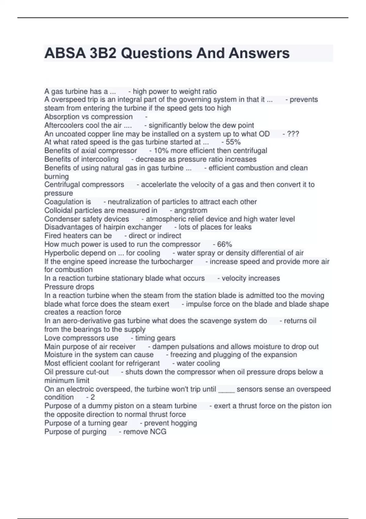 ABSA 3B2 Questions And Answers A gas turbine has a ... - high power to weight ratio A overspeed trip is an integral part of the governing system in that it ... - prevents steam from entering the turbine if the speed gets too high Absorption vs compression - Aftercoolers cool the air .... - significantly below the dew point An uncoated copper line may be installed on a system up to what OD - ??? At what rated speed is the gas turbine started at ... - 55% Benefits of axial compressor - 10% more efficient then centrifugal Benefits of intercooling - decrease as pressure ratio increases Benefits of using natural gas in gas turbine ... - efficient combustion and clean burning Centrifugal compressors - accelerlate the velocity of a gas and then convert it to pressure Coagulation is - neutralization of particles to attract each other Colloidal particles are measured in - angrstrom Condenser safety devices - atmospheric relief device and high water level Disadvantages of hairpin exchanger - lots of places for leaks Fired heaters can be - direct or indirect How much power is used to run the compressor - 66% Hyperbolic depend on ... for cooling - water spray or density differential of air If the engine speed increase the turbocharger - increase speed and provide more air for combustion In a reaction turbine stationary blade what occurs - velocity increases Pressure drops In a reaction turbine when the steam from the station blade is admitted too the moving blade what force does the steam exert - impulse force on the blade and blade shape creates a reaction force In an aero-derivative gas turbine what does the scavenge system do - returns oil from the bearings to the supply Love compressors use - timing gears Main purpose of air receiver - dampen pulsations and allows moisture to drop out Moisture in the system can cause - freezing and plugging of the expansion Most efficient coolant for refrigerant - water cooling Oil pressure cut-out - shuts down the compressor when oil pressure drops below a minimum limit On an electroic overspeed, the turbine won't trip until ____ sensors sense an overspeed condition - 2 Purpose of a dummy piston on a steam turbine - exert a thrust force on the piston ion the opposite direction to normal thrust force Purpose of a turning gear - prevent hogging Purpose of purging - remove NCG Purpose of the HP cut-out is to ... - stop the compressor before the pressure relief device release Purposes of oil systems - lubricate and cool Reciprocating compressors are divided into types according to .... - single or double acting and cylinder arrangement Refrigerant is added ... - between the liquid shutoff valve and expansion valve Refrigerant is classified by ... - flammability and toxicity Speed sensitive governors - mechanical mechanical hydraulic electric hydraulic Surge will occur - when the pressure rises above the surge po