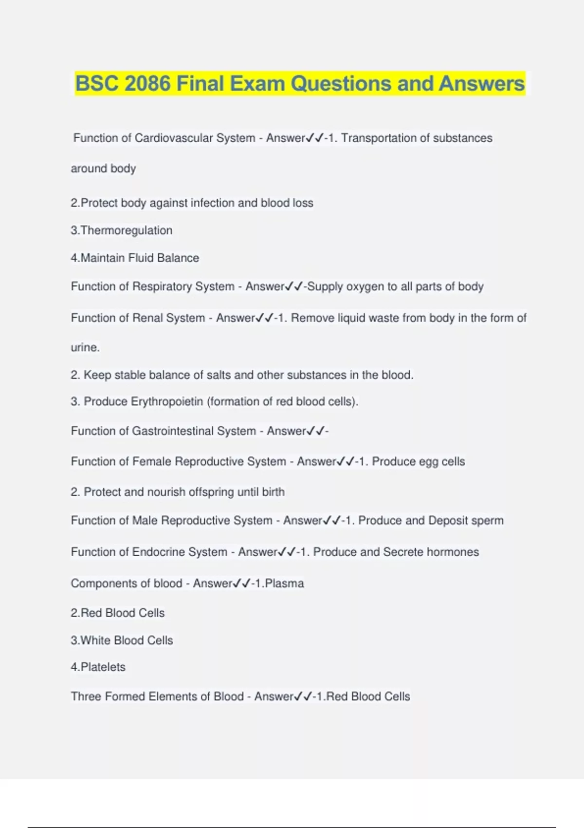 BSC 2086 Final Exam Questions and Answers Function of Cardiovascular System - Answer️️ -1. Transportation of substances around body 2.Protect body against infection and blood loss 3.Thermoregulation 4.Maintain Fluid Balance Function of Respiratory System - Answer️️ -Supply oxygen to all parts of body Function of Renal System - Answer️️ -1. Remove liquid waste from body in the form of urine. 2. Keep stable balance of salts and other substances in the blood. 3. Produce Erythropoietin (formation of red blood cells). Function of Gastrointestinal System - Answer️️ - Function of Female Reproductive System - Answer️️ -1. Produce egg cells 2. Protect and nourish offspring until birth Function of Male Reproductive System - Answer️️ -1. Produce and Deposit sperm Function of Endocrine System - Answer️️ -1. Produce and Secrete hormones Components of blood - Answer️️ -1.Plasma 2.Red Blood Cells 3.White Blood Cells 4.Platelets Three Formed Elements of Blood - Answer️️ -1.Red Blood Cells 2.White Blood Cells 3. Platelets Red blood Cells - Answer️️ --Called Erythrocytes -Most abundant -contain hemoglobin -Life:about 120 days -no nucleus:Carry Oxygen, need all room for hemoglobin Hemoglobin - Answer️️ --contains iron -responsible for transporting oxygen and carbon dioxide White Blood Cells - Answer️️ --Called Leukocytes -Defend body against bacteria, viruses, and parasites. -high numbers could cause cancer -have large nuclei Platelets - Answer️️ --colorless & shaped irregularly -performs blood clotting to prevent blood loss -Harmful when clots around vessel; prevents blood flow -contains vesicles called granules Components of Plasma - Answer️️ --Mostly water -dissolved protein -glucose -amino acids -vitamins -minerals -urea -uric acid -CO2 -antibodies -hormones Blood Types - Answer️️ --Group A -Group B -Group AB -Group O Group A Blood - Answer️️ --Has A Antigen -Has B Antibody Group B Blood - Answer️️ --Has B Antigen -Has A Antibody Group AB Blood - Answer️️ --Has both A & B antigen -Does not have A or B Antibody Group O Blood - Answer️️ --Does not have A or B antige