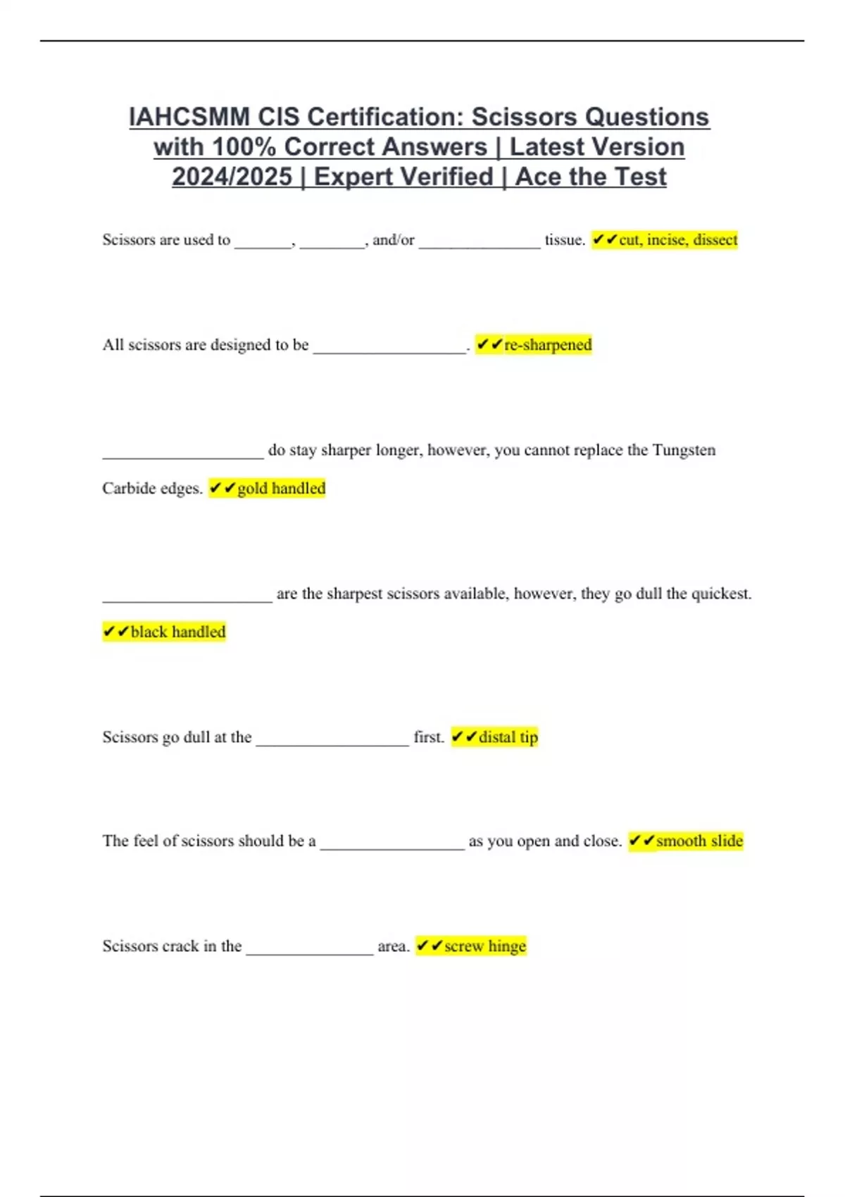 IAHCSMM CIS Certification: Scissors Questions with 100% Correct Answers | Latest Version 2024/2025 | Expert Verified | Ace the Test