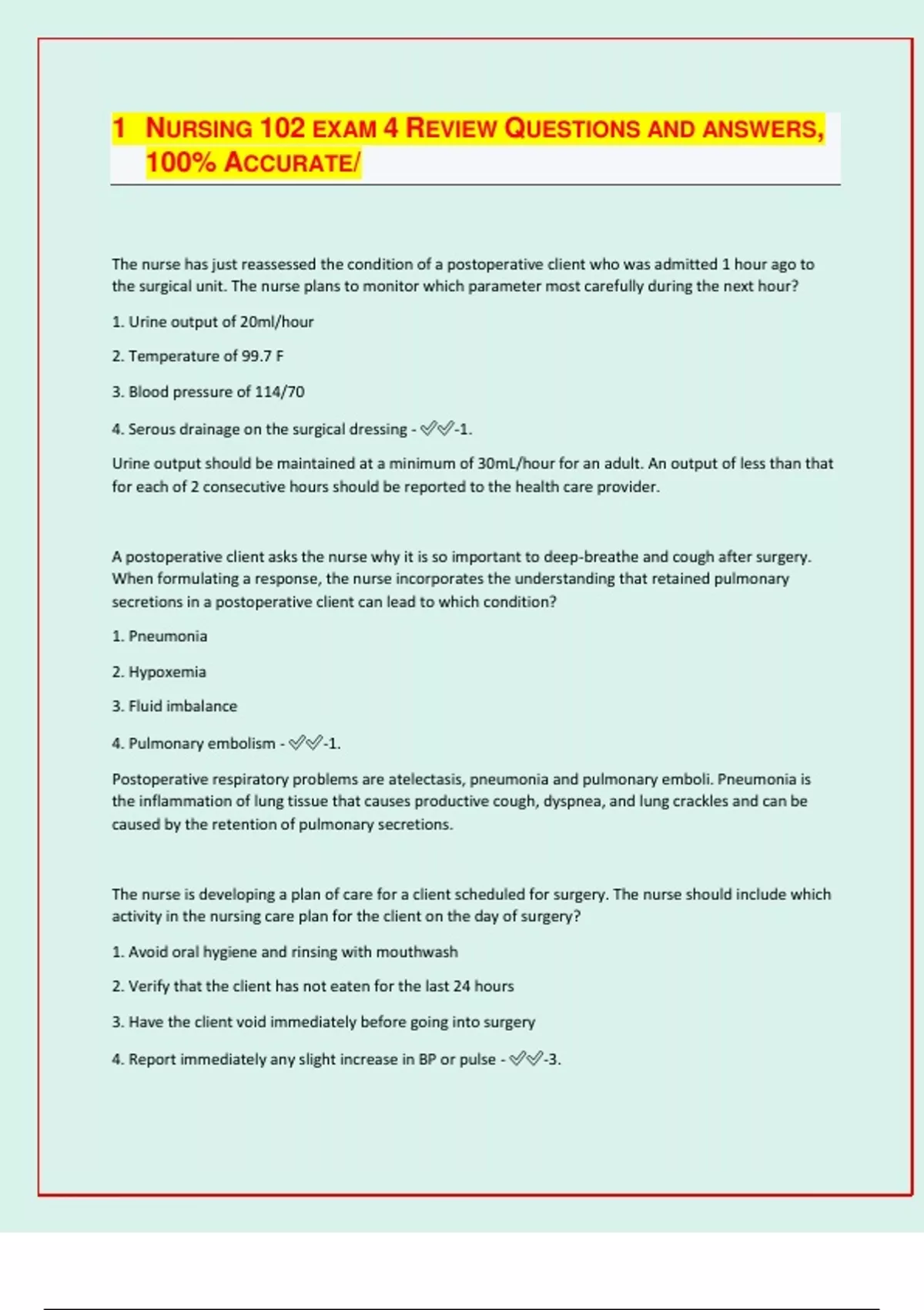 NURSING 102 EXAM 4 REVIEW QUESTIONS AND ANSWERS, 100% ACCURATE/ The nurse has just reassessed the condition of a postoperative client who was admitted 1 hour ago to the surgical unit. The nurse plans to monitor which parameter most carefully during the next hour? 1. Urine output of 20ml/hour 2. Temperature of 99.7 F 3. Blood pressure of 114/70 4. Serous drainage on the surgical dressing - -1. Urine output should be maintained at a minimum of 30mL/hour for an adult. An output of less than that for each of 2 consecutive hours should be reported to the health care provider. A postoperative client asks the nurse why it is so important to deep-breathe and cough after surgery. When formulating a response, the nurse incorporates the understanding that retained pulmonary secretions in a postoperative client can lead to which condition? 1. Pneumonia 2. Hypoxemia 3. Fluid imbalance 4. Pulmonary embolism - -1. Postoperative respiratory problems are atelectasis, pneumonia and pulmonary emboli. Pneumonia is the inflammation of lung tissue that causes productive cough, dyspnea, and lung crackles and can be caused by the retention of pulmonary secretions. The nurse is developing a plan of care for a client scheduled for surgery. The nurse should include which activity in the nursing care plan for the client on the day of surgery? 1. Avoid oral hygiene and rinsing with mouthwash 2. Verify that the client has not eaten for the last 24 hours 3. Have the client void immediately before going into surgery 4. Report immediately any slight increase in BP or pulse - -3. The nurse would assist the client to void immediately before surgery so that the bladder will be empty. Oral hygiene is allowed, but the client should not swallow any water. The client usually has a restriction of food and fluids for 6 to 8 hours before surgery instead of 24 hours. A slight increase in BP and pulse is common during the preoperative period due to anxiety. A client with a perforated gastric ulcer is scheduled for surgery. The client cannot sign the operative consent form because of sedation from opioid analgesics that have been administered. The nurse should take which most appropriate action in the care of this client? 1. Obtain a court order for the surgery. 2. Have the charge nurse sign the informed consent immediately 3. Send the client to surgery without the consent form being signed 4. Obtain a telephone consent from a family member, following agency policy - -4. Every effort should be made to obtain permission from a responsible family member to perform surgery if the client is unable to sign the consent form. A telephone consent must be witnessed by two persons who hear the family member's oral consent. The two witnesses then sign the consent with the name of the family member, noting that an oral consent was obtained. Consent is not informed if it is obtained from a client who is confused, unconscious, mentally incompetent, or under the influence of sedatives. In an emergency the client may not be able to sign and family members may not be available. In this situation, a health care provider is permitted legally to perform surgery without consent, but tin this case it is not an emergency. Agency policies regarding informed consent should always be followed. A preoperative client expresses anxiety to the nurse about upcoming surgery. Which response by the nurse is most likely to stimulate further discussion between the client and the nurse? 1. "If it's any help, everyone is nervous before surgery." 2. "I will be happy to explain the entire surgical procedure with you." 3. "Can you share with me what you've been told about your surgery?" 4. "Let me tell you about the care you'll receive after surgery and the amount of pain you can anticipate". - -3. Explanations should begin with the information that the client knows. By providing the client with individualized explanations of care and procedures, the nurse can assist the client in handling anxiety and fear for a smooth preoperative experience. Clients who are calm and emotionally prepared for surgery withstand anesthesia better and experience fewer postoperative complications. The nurse is conducting preoperative teaching with a client about the use of an incentive spirometer. The nurse should include which piece of information in discussions with the client? 1. Inhale as rapidly as possible 2. Keep a loose seal between the lips and the mouthpiece 3. After maximum inspiration, hold the breath for 15 seconds and exhale. 4. The best results are achieved when sitting up or with the head of the bed elevated 45 to 90 degrees - -4 For optimal lung expansion with the incent