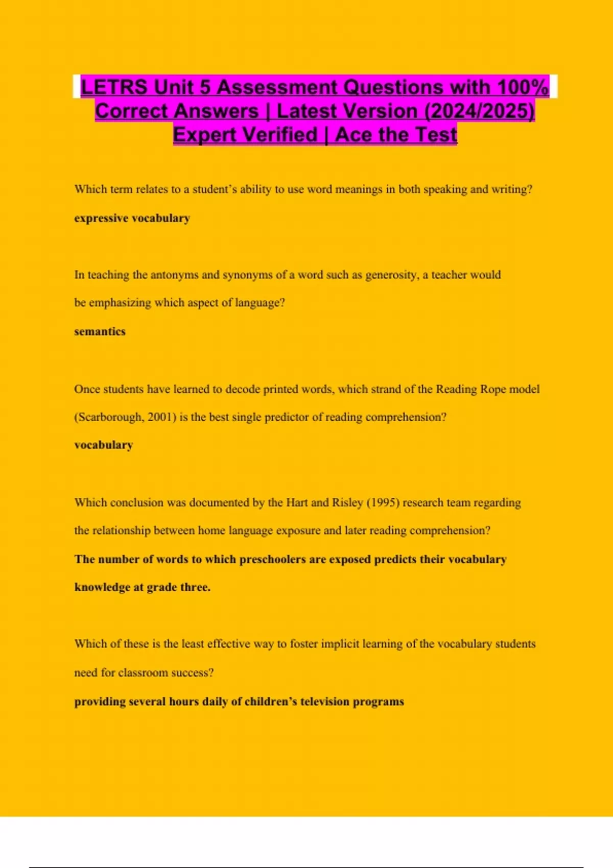 LETRS Unit 5 Assessment Questions with 100% Correct Answers | Latest Version (2024/2025) Expert Verified | Ace the Test