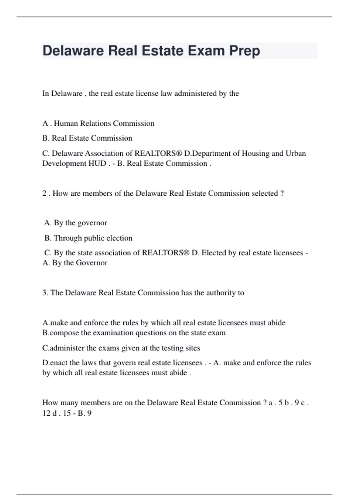 In Delaware , the real estate license law administered by the A . Human Relations Commission B. Real Estate Commission C. Delaware Association of REALTORS® D.Department of Housing and Urban Development HUD . - B. Real Estate Commission . 2 . How are members of the Delaware Real Estate Commission selected ? A. By the governor B. Through public election C. By the state association of REALTORS® D. Elected by real estate licensees - A. By the Governor 3. The Delaware Real Estate Commission has the authority to A.make and enforce the rules by which all real estate licensees must abide B.compose the examination questions on the state exam C.administer the exams given at the testing sites D.enact the laws that govern real estate licensees . - A. make and enforce the rules by which all real estate licensees must abide . How many members are on the Delaware Real Estate Commission ? a . 5 b . 9 c . 12 d . 15 - B. 9 - B. A random selection of licensees. Which of the following statements regarding the Delaware Real Estate Commission is FALSE? a. Members of the commission are selected by the state association of REALTORS®. b. The commission makes and enforces the rules by which all real estate licensees must abide. c. The examinations that must be taken by all applicants for real estate licensing are administered by an independent testing company. d. The operation of the commission's activities is administered by an executive director specifically hired for that purpose. - a. Members of the commission are selected by the state association of REALTORS®. - d. agreeing with a seller to accept a listing for more than the normal commission rate. - d. deposits a buyer's down payment in a personal bank account. - b. depositing earnest money into the firm's escrow account. 10. For which of the following acts is the Delaware Real Estate Commission required to suspend or revoke a licensee's license? a. Failing to perform as promised in a guaranteed sales plan b. Having been found liable in a criminal trial for bribery