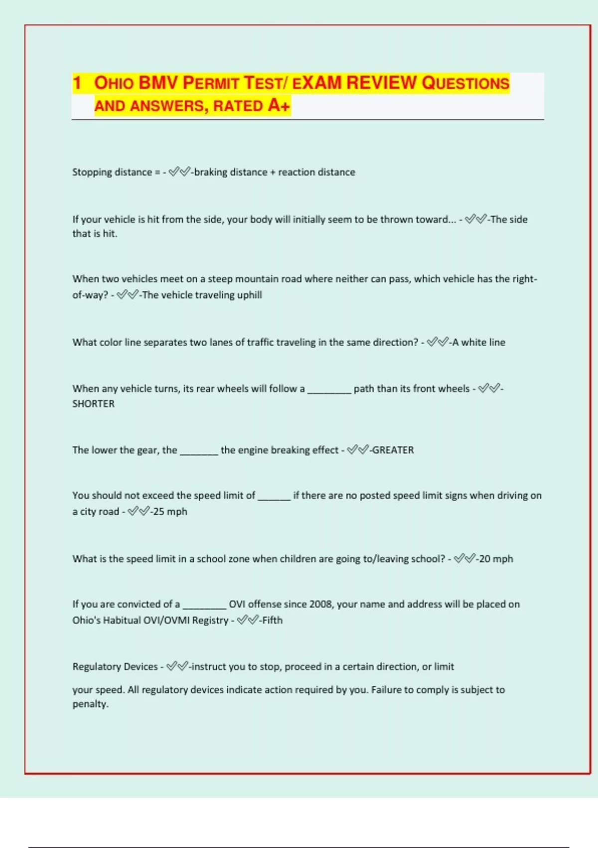 OHIO BMV PERMIT TEST/ EXAM REVIEW QUESTIONS AND ANSWERS, RATED A+ Stopping distance = - -braking distance + reaction distance If your vehicle is hit from the side, your body will initially seem to be thrown toward... - -The side that is hit. When two vehicles meet on a steep mountain road where neither can pass, which vehicle has the rightof-way? - -The vehicle traveling uphill What color line separates two lanes of traffic traveling in the same direction? - -A white line When any vehicle turns, its rear wheels will follow a ________ path than its front wheels - - SHORTER The lower the gear, the _______ the engine breaking effect - -GREATER You should not exceed the speed limit of ______ if there are no posted speed limit signs when driving on a city road - -25 mph What is the speed limit in a school zone when children are going to/leaving school? - -20 mph If you are convicted of a ________ OVI offense since 2008, your name and address will be placed on Ohio's Habitual OVI/OVMI Registry - -Fifth Regulatory Devices - -instruct you to stop, proceed in a certain direction, or limit your speed. All regulatory devices indicate action required by you. Failure to comply is subject to penalty. in a roundabout, you must drive in a _______ direction and _______ to vehicles inside - - counterclockwise - yield You may not park within how many feet of a crosswalk? - -20 feet You may not park within ______ feet of a flashing beacon, stop sign, or traffic signal - -30 feet At a flashing yellow traffic signal, you must... - -slow down and proceed with caution. Flashing yellow traffic signals are like a warning sign, used to alert drivers to potential hazards. In Ohio, when is it legal to make a left turn at a red light? - -When turning from a one-way street onto another one-way street. If the YELLOW edge of the roadway is on your RIGHT, you are.... - -traveling in the WRONG direction (yellow = left edge line, white = rig