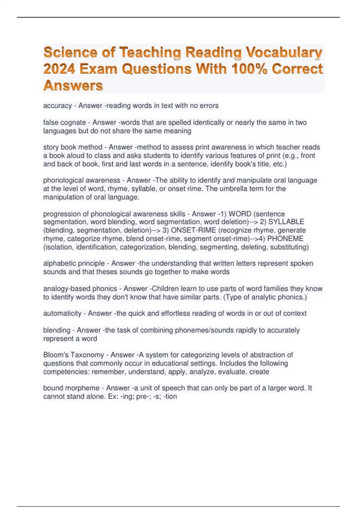 Science of Teaching Reading Vocabulary 2024 Exam Questions With 100% Correct Answers accuracy - Answer -reading words in text with no errors false cognate - Answer -words that are spelled identically or nearly the same in two languages but do not share the same meaning story book method - Answer -method to assess print awareness in which teacher reads a book aloud to class and asks students to identify various features of print (e.g., front and back of book, first and last words in a sentence, identify book's title, etc.) phonological awareness - Answer -The ability to identify and manipulate oral language at the level of word, rhyme, syllable, or onset rime. The umbrella term for the manipulation of oral language. progression of phonological awareness skills - Answer -1) WORD (sentence segmentation, word blending, word segmentation, word deletion)-- 2) SYLLABLE (blending, segmentation, deletion)-- 3) ONSET-RIME (recognize rhyme, generate rhyme, categorize rhyme, blend onset-rime, segment onset-rime)--4) PHONEME (isolation, identification, categorization, blending, segmenting, deleting, substituting) alphabetic principle - Answer -the understanding that written letters represent spoken sounds and that theses sounds go together to make words analogy-based phonics - Answer -Children learn to use parts of word families they know to identify words they don't know that have similar parts. (Type of analytic phonics.) automaticity - Answer -the quick and effortless reading of words in or out of context blending - Answer -the task of combining phonemes/sounds rapidly to accurately represent a word Bloom's Taxonomy - Answer -A system for categorizing levels of abstraction of questions that commonly occur in educational settings. Includes the following competencies: remember, understand, apply, analyze, evaluate, create bound morpheme - Answer -a unit of speech that can only be part of a larger word. It cannot stand alone. Ex: -ing; pre-; -s; -tion chunking - Answer -a decoding strategy for breaking words into manageable parts (e. g. /yes/ter/day). Also refers to the process of dividing a sentence into smaller phrases where phrases might occur naturally. cloze test - Answer -an assessment consisting of a passage with certain words (usually every 5th word) missing. The student is asked to fill in the missing words. coarticulation - Answer -when saying words our mouth is always ready for the next sound to be made. While saying one sound, the lips, tongue, etc. are starting to form the sound to follow. This can distort individual sounds during speech because the sounds are not produced in isolated units (because of this, some children have difficulty hearing the individual sounds in words and the concept of phonemes needs to be explicitly brought to their attention through instruction) cognates - Answer -words in two languages that share a similar spelling, pronunciation, and meaning comprehension monitoring - Answer -self monitoring one's understanding of text; aka metacognition; knowing what is clear and what is confusing—a reader doing this has the capability to make repairs to problems with comprehension. comprehension, fluency, phonemic awareness, phonics, vocabulary - Answer -The five components of reading as identified by the National Reading Panel (NPR) concept definition map - Answer -a type of graphic organizer which provides a visual framework for organizing conceptual information in the process of defining a word or concept. Includes the category, properties, and examples of the word or concept. connected text - Answer -words that are linked (as opposed to words in a list) as in sentences, phrases, and paragraphs consonant blend - Answer -two or more consecutive consonants which retain their individual sounds (eg., bl, str, cr ) consonant digraph - Answer -two consecutive consonants that represent one phoneme (ch, sh, th) criterion referenced test - Answer -assessment which is scored based on a pre-established benchmark or standard culture load - Answer -the amount of cultural knowledge required to comprehend meaning or participate in an activity