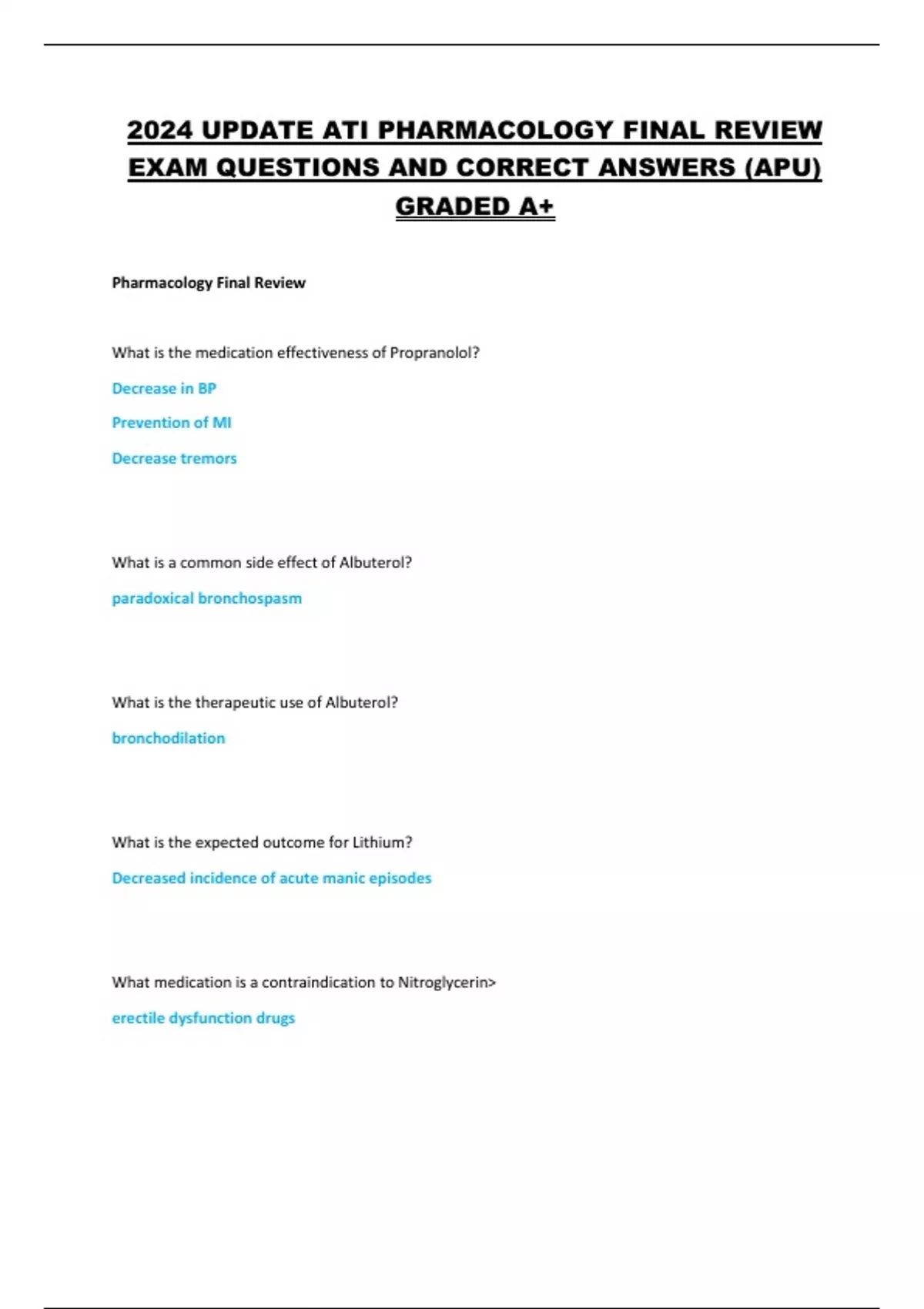 2024 UPDATE ATI PHARMACOLOGY FINAL REVIEW EXAM QUESTIONS AND CORRECT ANSWERS (APU) GRADED A+
