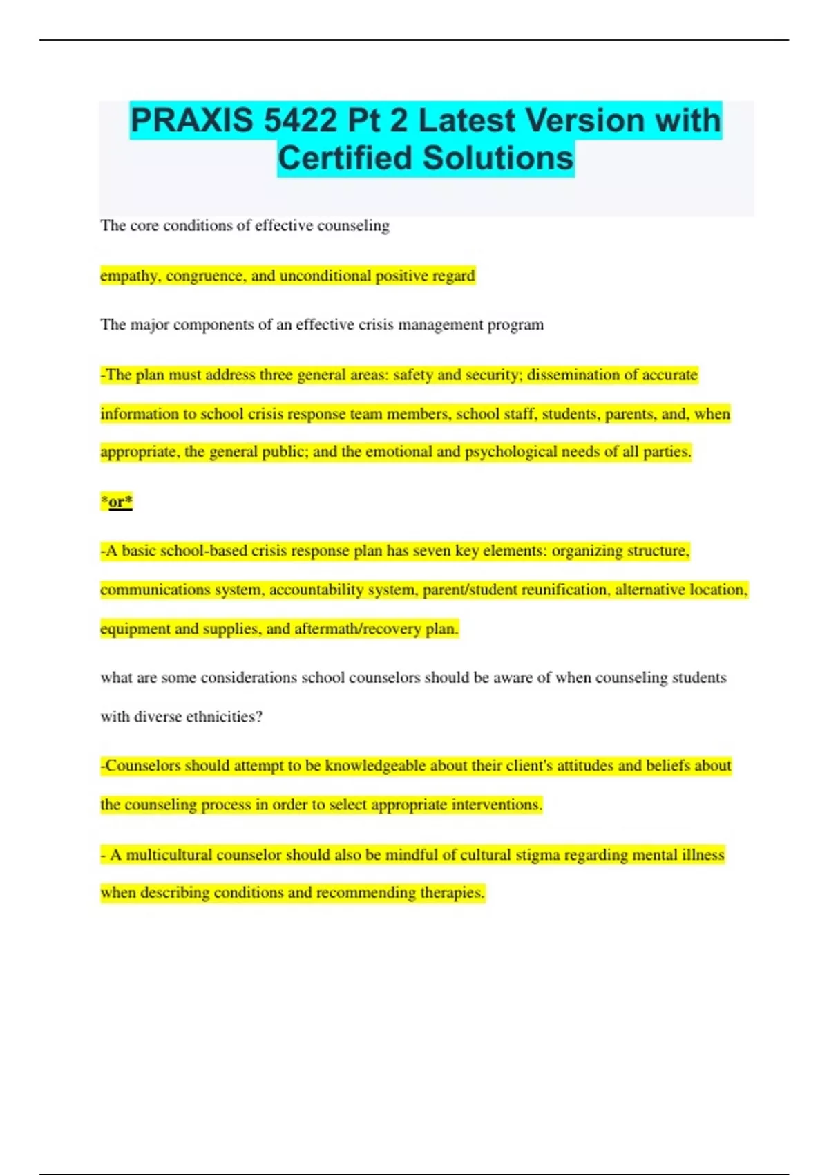 PRAXIS 5422 Pt 2 Latest Version with Certified Solutions The core conditions of effective counseling empathy, congruence, and unconditional positive regard The major components of an effective crisis management program -The plan must address three general areas: safety and security; dissemination of accurate information to school crisis response team members, school staff, students, parents, and, when appropriate, the general public; and the emotional and psychological needs of all parties. *or* -A basic school-based crisis response plan has seven key elements: organizing structure, communications system, accountability system, parent/student reunification, alternative location, equipment and supplies, and aftermath/recovery plan. what are some considerations school counselors should be aware of when counseling students with diverse ethnicities? -Counselors should attempt to be knowledgeable about their client's attitudes and beliefs about the counseling process in order to select appropriate interventions. - A multicultural counselor should also be mindful of cultural stigma regarding mental illness when describing conditions and recommending therapies. -language, thoughts, communications, actions, customs, beliefs, values, and institutions of racial, ethnic, religious, or social groups” as relevant influences that counselors should be aware of when assisting students What are the rights of parents information about their children's counseling? -Parents legally hold the privacy rights of their children and have a large say in what services their child receives. In a related issue, children's right to access support from school counselors unless a parent requests otherwise is a generally accepted practice -Sharing information with parents/guardians is important when a student's safety is in question but other than that the counselor does not have to share everything with the parent What school staff is required to report abuse and neglect? all school employees what is the effect of FERPA on the work of the professionals school counselor? -FERPA requires parental consent to release information to certain other parties;, however, "the law empowers school officials to act decisively and quickly when issues arise." -In an emergency, FERPA permits school officials to disclose without consent education records, including personally identifiable information from those records, to protect the health or safety of students or other individuals. At such times, records and information may be released to appropriate parties such as law enforcement officials, public health officials and trained medical personnel. This exception is limited to the period of the emergency and generally does not allow for a blanket release of personally identifiable information from a student's education records How do school counselors analyze student outcomes? An example of a measure of outcome data would be the number of students who receive more than one failing grade, then again measuring that number after those students attend a semester- long study skills group. Outcome data is used to assess changes to the data upon finishing the intervention to provide an understanding of the intervention's impact. This data serves as quantitative support to show student improvement during the course of the intervention, allowing more effective advocacy for the school counseling program. What is the purpose of theories in individual school counseling? -Theory gives a framework for integrity between understanding, interpretation and, ultimately, action. -a counseling theory is a model of understanding and intervention; it provides the clinician with ways to view and to change a client's behaviors, feelings, thoughts, or interactions. person-centered therapy -belief in the inner resources of the client that create the therapeutic climate for growth -creates safe space to talk and self-actualize Gestalt therapy -experience the present moment more fully and gain awareness of what we are doing Example: empty chair technique. This technique involves a client imagining and participating in a conversation with another person or a different part of themselves. Bheavior Therapy -most behavior is learned and therefore can be unlearned cognitive behavioral therapy -changing thoughts is the path to changing behaviors and feelings example: journaling, ERP, etc. Reality Therapy -we always have a choice -helps assuming personal responsibility and dealing with the present Solution Focused Therapy -Solution-Focused Brief Therapy is a short-term goal-focused evidence- based therapeutic approach to help clients construct solutions. -constructing solutions, not focusing on problems examples: scaling, miracle question what is the school counselors role in educational planning? techniques? -Collaborating with students, families, educational staff and the community, the school counselor works to ensure all students develop an academic and career plan reflecting their interests, abilities and goals and including rigorous, relevant coursework and experiences appropriate for the student. how do school counselors help students with career