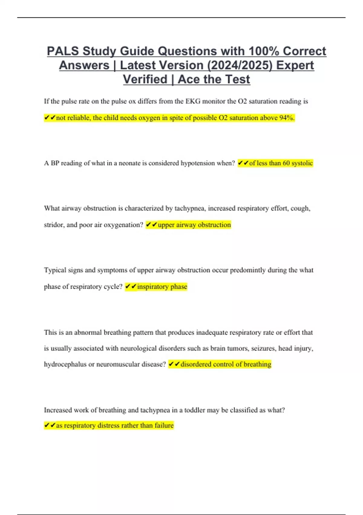 PALS Study Guide Questions with 100% Correct Answers | Latest Version (2024/2025) Expert Verified | Ace the Test