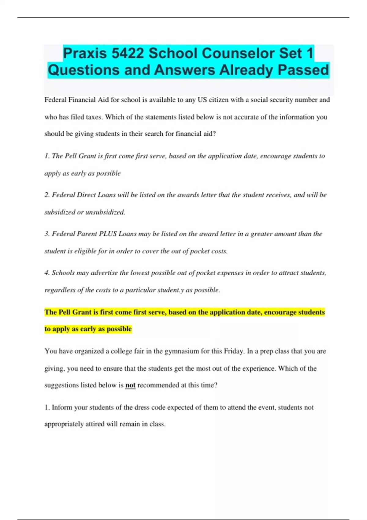 Praxis 5422 School Counselor Set 1 Questions and Answers Already Passed Federal Financial Aid for school is available to any US citizen with a social security number and who has filed taxes. Which of the statements listed below is not accurate of the information you should be giving students in their search for financial aid? 1. The Pell Grant is first come first serve, based on the application date, encourage students to apply as early as possible 2. Federal Direct Loans will be listed on the awards letter that the student receives, and will be subsidized or unsubsidized. 3. Federal Parent PLUS Loans may be listed on the award letter in a greater amount than the student is eligible for in order to cover the out of pocket costs. 4. Schools may advertise the lowest possible out of pocket expenses in order to attract students, regardless of the costs to a particular student.y as possible. The Pell Grant is first come first serve, based on the application date, encourage students to apply as early as possible You have organized a college fair in the gymnasium for this Friday. In a prep class that you are giving, you need to ensure that the students get the most out of the experience. Which of the suggestions listed below is not recommended at this time? 1. Inform your students of the dress code expected of them to attend the event, students not appropriately attired will remain in class. 2. Supply the students with a list of the schools being represented and encourage them to find their top ten schools to speak and research. 3. Encourage the students to collect as much information as possible at the fair, including lessor known schools that may not be on the student's top ten list. 4. Encourage students to use their time well, and allow for time for completing applications for admission, scholarship requests and other timely forms. Encourage students to use their time well, and allow for time for completing applications for admission, scholarship requests and other timely forms. A school counselor is having a conversation with the principal. The conversation is about different assessment tools that can be used to gain information to better help students' progress. The counselor brought up having students write summaries of what they have just learned. This is an example of what type of assessment tool? 1. This is an example of a summative assessment tool. 2. The counselor stated that this is an example of a correctional assessment tool. 3. According to the counselor, this is an example of a formative assessment tool. 4. The counselor stated that this is an example of a indirect assessment tool. According to the counselor, this is an example of a formative assessment tool Formative assessments are used to provide feedback to school staff and the student. It monitors the progress made by students. Examples include quizzes and writing summaries of lectures. Behavior theory includes all of the following EXCEPT 1. conditioning 2. reinforcement 3. learning theory 4. developmental stages Developmental stages The positive influence of technology on school counseling faces a series of challenges, with which of the following being a common one? 1. Time consumption sourcing for materials. 2. Online sharing of lesson materials. 3. Online reputation and privacy. 4. Lack of appropriate information online. Online reputation and privacy. The school counselor is writing one part of the crisis plan. She is writing the section that includes: allocating appropriate time for mending and doing an assessment of curricular activities that address the crisis. Which section is the school counselor working on? 1. The school counselor is writing information for the recovery section of the plan. 2. The school counselor is adding information to the response section of the crisis plan. 3. The school counselor is writing information to be used in the preparedness section. 4. This information belongs in the mitigation