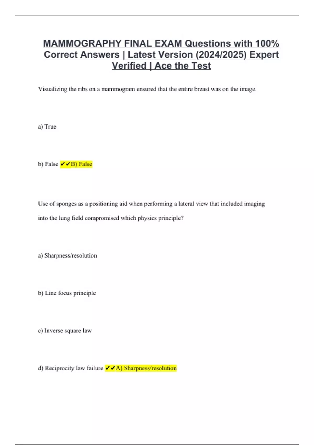 MAMMOGRAPHY FINAL EXAM Questions with 100% Correct Answers | Latest Version (2024/2025) Expert Verified | Ace the Test