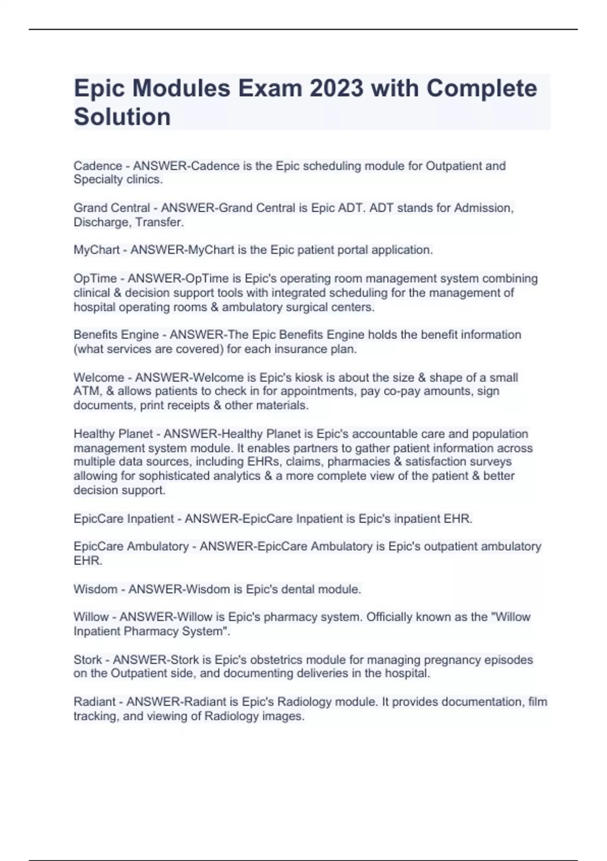 Epic Modules Exam 2023 with Complete SolutionEpic Modules Exam 2023 with Complete SolutionEpic Modules Exam 2023 with Complete SolutionEpic Modules Exam 2023 with Complete Solution Cadence - ANSWER-Cadence is the Epic scheduling module for Outpatient and Specialty clinics. Grand Central - ANSWER-Grand Central is Epic ADT. ADT stands for Admission, Discharge, Transfer. MyChart - ANSWER-MyChart is the Epic patient portal application. OpTime - ANSWER-OpTime is Epic's operating room management system combining clinical & decision support tools with integrated scheduling for the management of