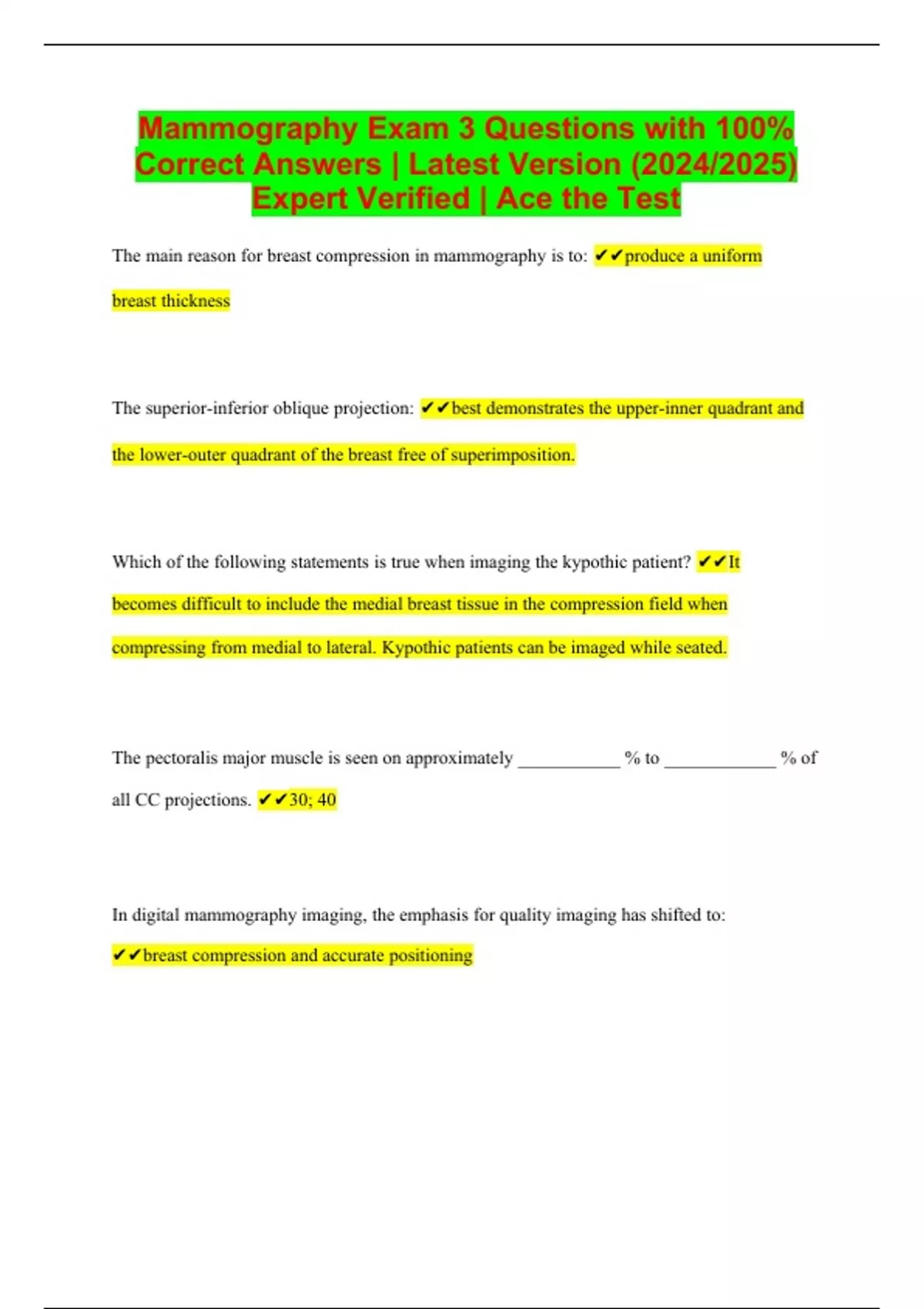 Mammography Exam 3 Questions with 100% Correct Answers | Latest Version (2024/2025) Expert Verified | Ace the Test