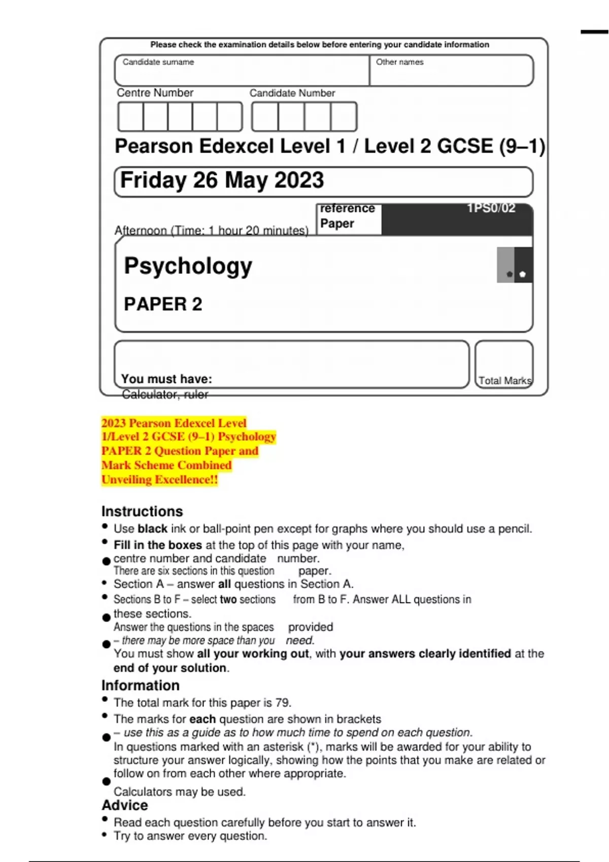 2023 Pearson Edexcel Level 1/Level 2 GCSE (9–1) Psychology PAPER 2 Question Paper and Mark Scheme Combined Unveiling Excellence!!