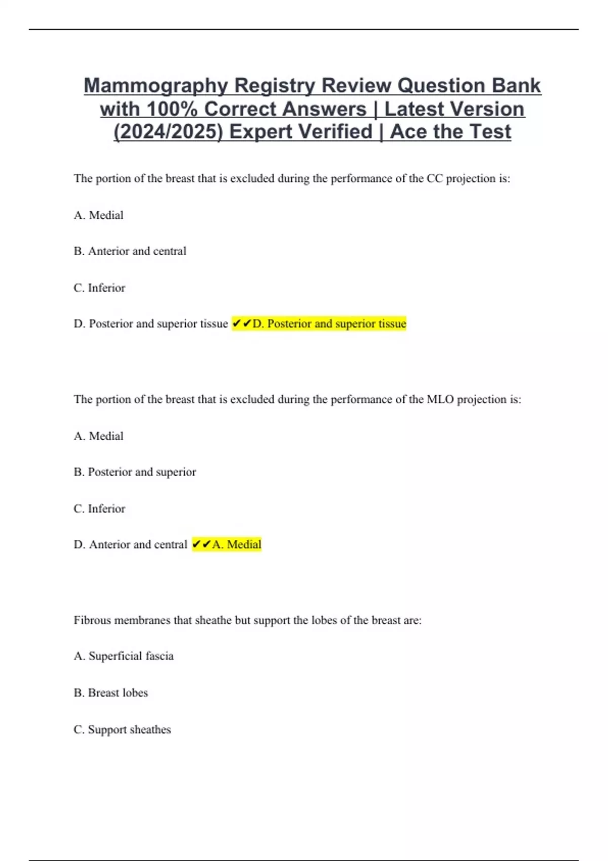 Mammography Registry Review Question Bank with 100% Correct Answers | Latest Version (2024/2025) Expert Verified | Ace the Test